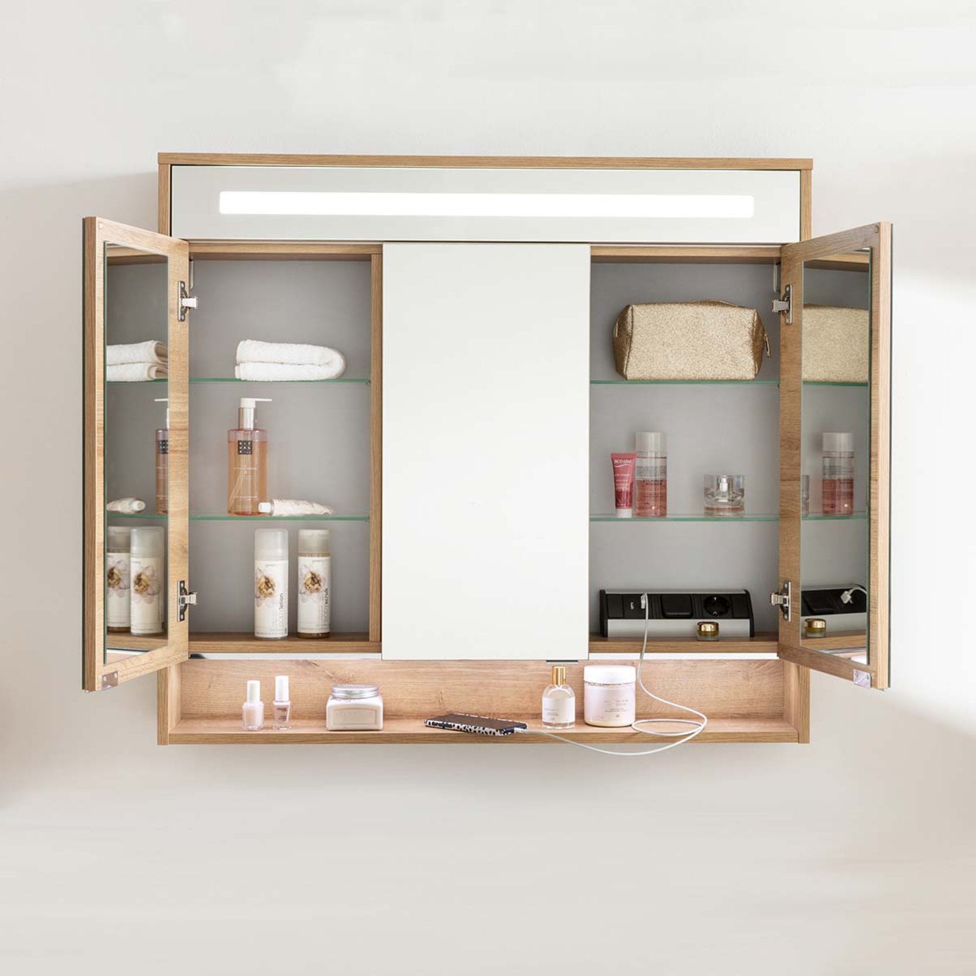 - Ausstattung: 3 Türen, linke und rechte Tür mit Innenspiegel, 4 Glasböden, LED Leuchte 8,4 Watt, gedämpfte Scharniere, Anschlusskabel ca. 85 cm, Rückwand silbergrau
