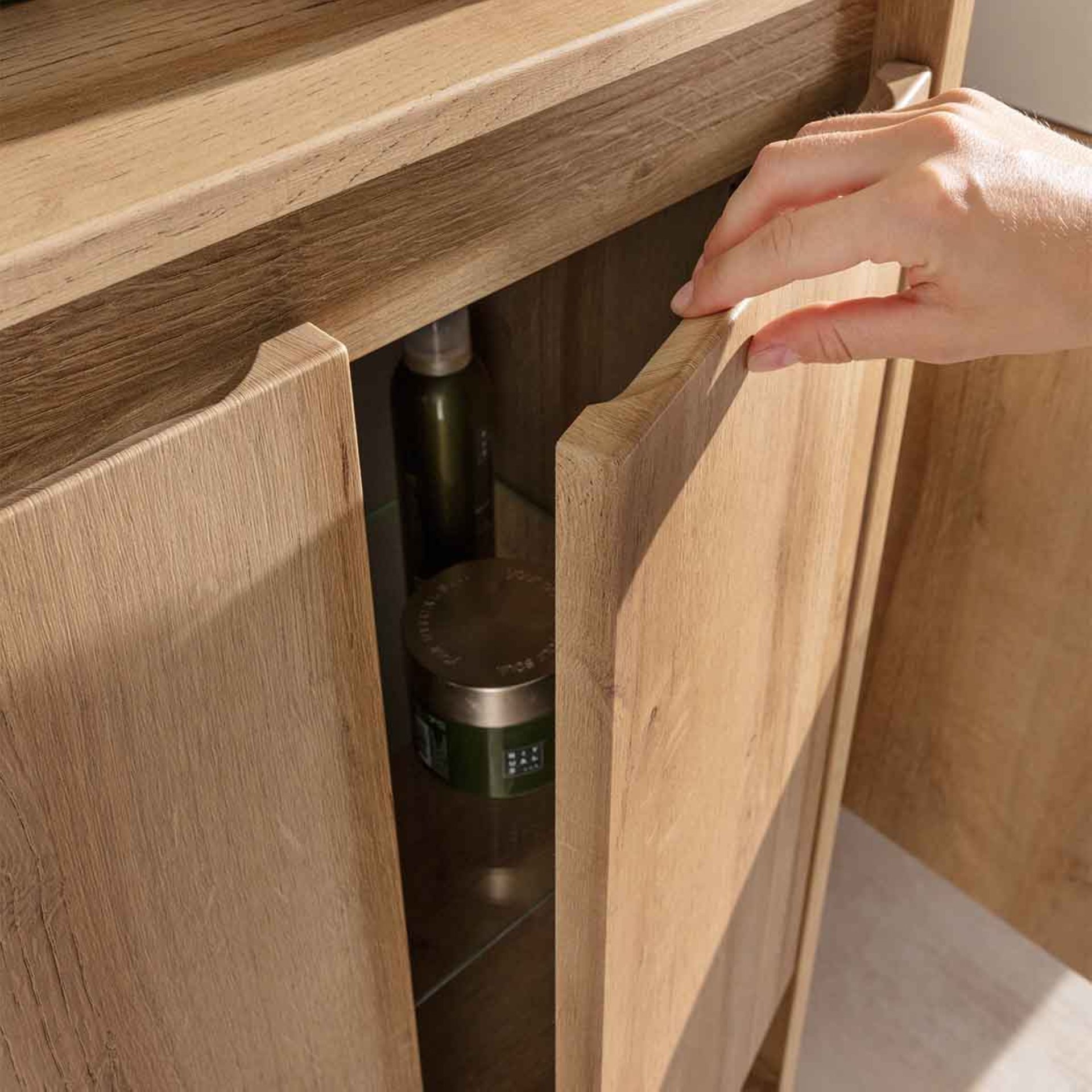 Das Besondere an diesem zweitürigen Midischrank ist die Maserung. Der Blick auf's Detail macht hier den Unterschied. Betrachtet man den Schrank rundum erhält man den Eindruck, als wäre er aus einem Stück Holz gefertigt. So nah an der Natur ist der neue Doppel-Midischrank von Fackelmann aus der Serie NATURA. Die neuen Badmöbel aus der Serie NATURA im Design Ast-Eiche(helles Braun) orientieren sich detailgetreu an der Struktur und dem Farbspiel des Eichenholzes. DerFackelmann NATURA Doppel Midischrank 60,5 cm breit, Braun hell hat eine Breite von 60 cm und ist mit seinen zwei grifflosen Türen ein dekoratives Stauraumwunder. Ein Glaseinlegeboden im Inneren sorgt für Struktur im Schrank. Ein offenes Ablagefach im unteren Teil rundet das Konzept ab. Zum sanften Schließen sind die Türen mit gedämpften Scharnieren ausgestattet. Mit viel Liebe zum Detail wird das Badmöbel für Dich in Deutschland hergestellt und vormontiert. Damit ist es ganz leicht in Deinem neuen Badezimmer integriert.