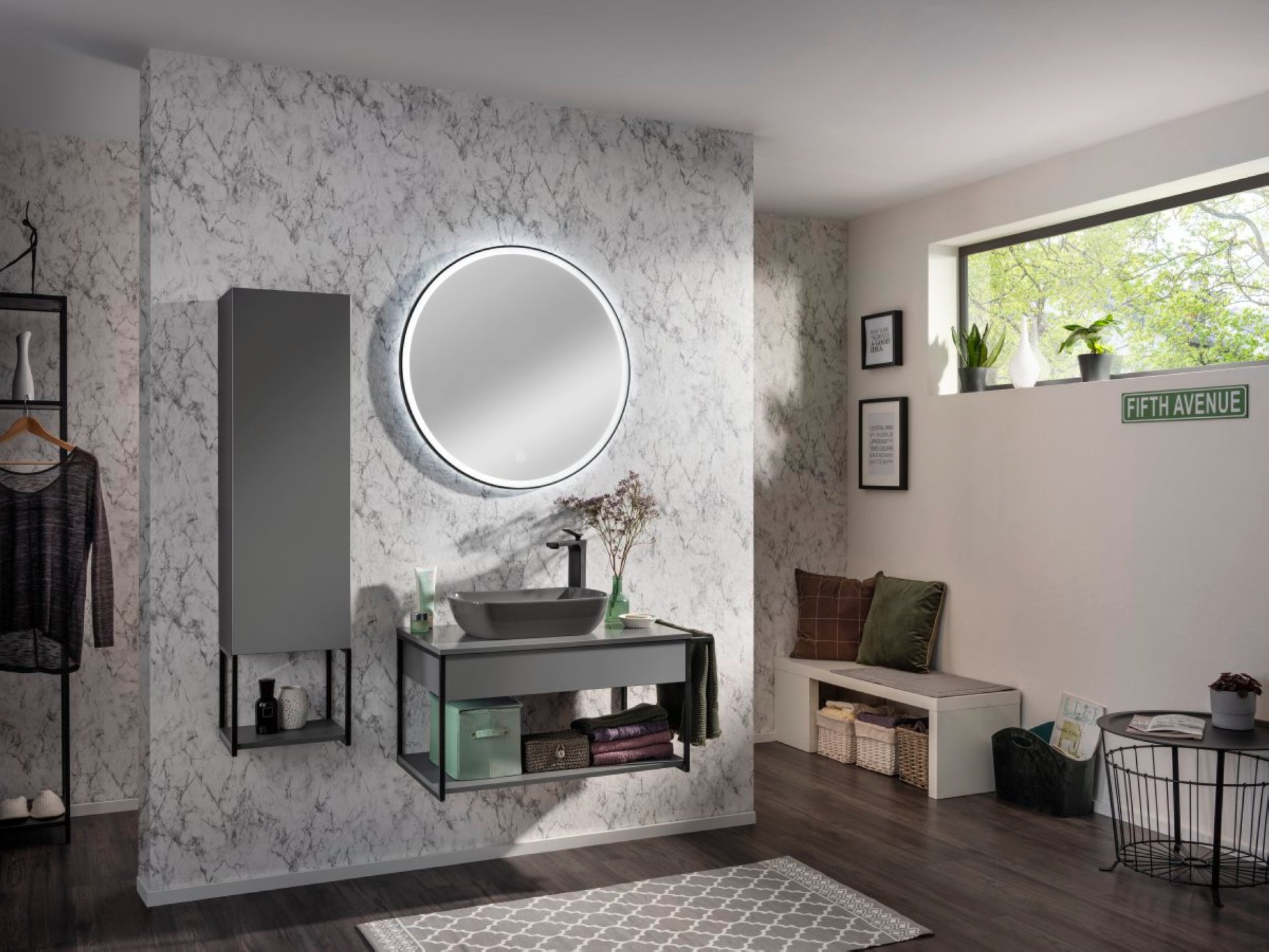 Passend zum Industrial Style der Serie NEW YORK von Fackelmann ist dieser Spiegel mit umlaufender LED-Beleuchtung. Der schwarze Rahmen bringt die dimmbaren LED's des runden Spiegels eindrucksvoll zur Geltung. Mit dem intelligenten Sensorschalter lässt sich der Fackelmann NEW YORK LED Spiegel rund Ø 80 cm mühelos an- und ausschalten.