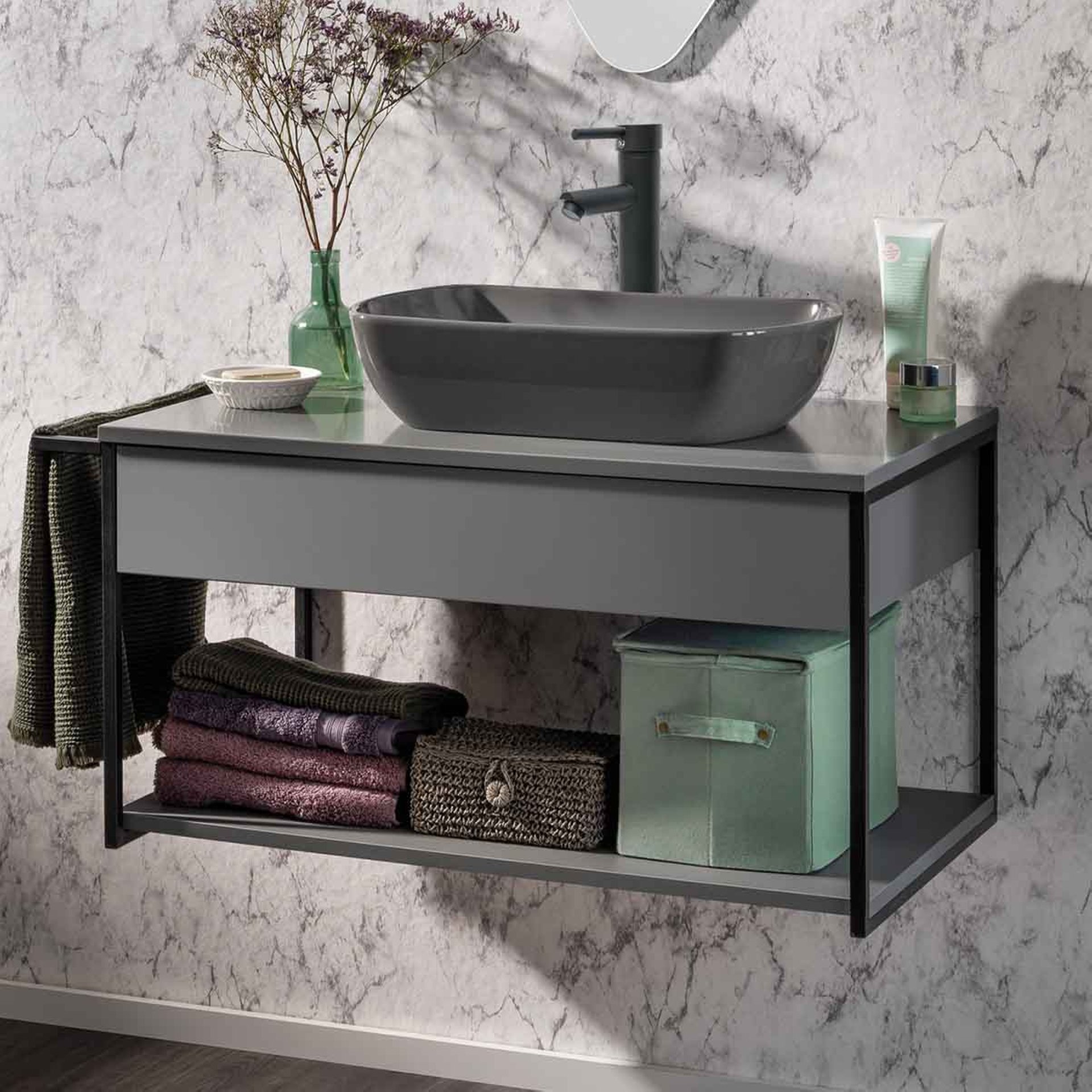 Die trendige, offene Rahmenkonstruktion des grauen Waschtisch-Unterschranks aus der Serie NEW YORK lässt viel Spielraum für eigene Badideen und Kreationen. Der schwarze, stabile Metallrahmen im Industrial Style verfügt über einen Handtuchhalter, den Du ganz nach Wunsch rechts oder links platzieren kannst. Ein weiteres Highlight ist die grifflose Schublade mit moderner Push-to-open-Technik und ihrer inneren schwarzen Farbgebung. Der Fackelmann NEW YORK Waschtischunterschrank 88 cm breit, Grau ist teilmontiert und wird mit einer leicht verständlichen Aufbauanleitung geliefert.