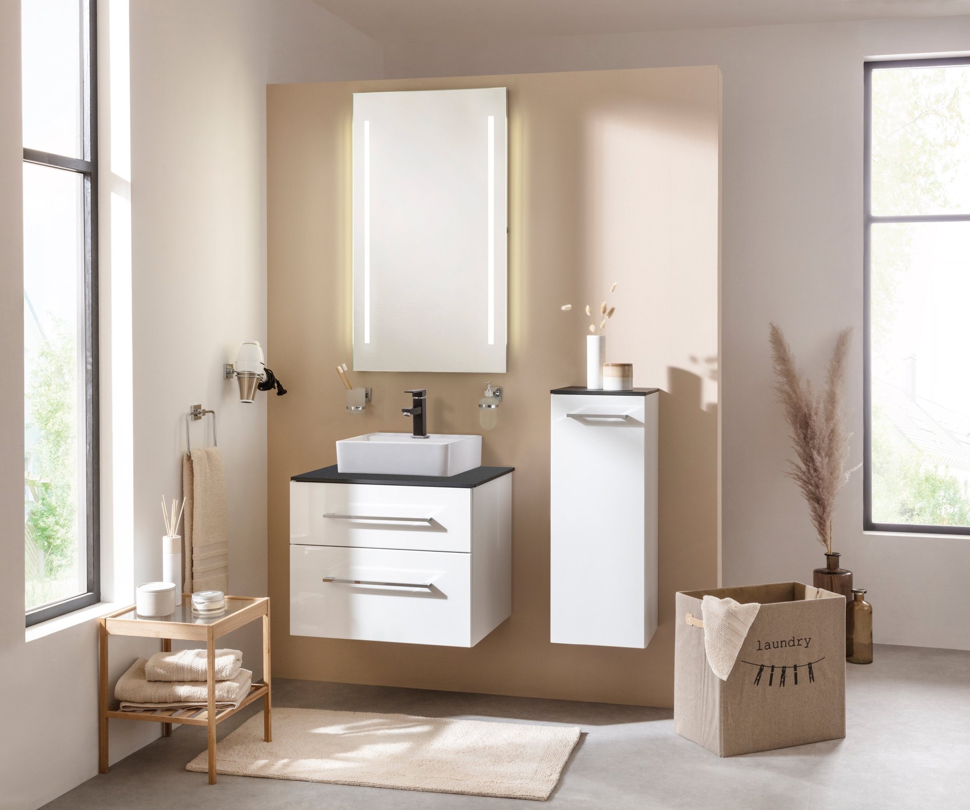 Die Krönung Deines 4-teiligen Sets aus der Serie OXFORD von Fackelmann ist der sehr schöne und moderne LED Spiegel. Ein schmaler Rahmen aus Aluminium gibt den Spiegel halt. Da der Hersteller Fackelmann hier Deiner Kreativität keine Grenzen setzen will, hast Du die Wahl zwischen Hoch- und Querformat. Folge Deiner Inspiration! Sichere Aufhängevorrichtungen sind vorhanden. Eine edle, schwarze High-Tech-Waschtischplatte mit einer Höhe von nur 12 mm verleiht dem Set Leichtigkeit und ist gleichzeitig ein außergewöhnlicher Blickfang. Sie eignet sich optimal für den Einsatz in Deinem Bad, da sie über eine kratzfeste und lösungsmittelbeständige Oberfläche verfügt, die leicht zu reinigen ist. Unterstrichen wird das exklusive Design durch das quadratische, weiße Keramikwaschbecken. Auf Grund seines Materials und der damit verbundenen Eigenschaften haben Keime und Bakterien keine Chance. Eine tiefe Waschmulde lässt Wasserspritzer da, wo sie hingehören. Die beiden Schubladen des weißen Waschtischunterschranks laden zur Ordnung im Badezimmer ein. Sie bieten ausreichend Platz für unterschiedliche Badaccessoires. Mit den beiden verchromten Griffen lassen sich die Schubladen einfach öffnen und durch das Soft-Close System sanft schließen. Mit viel Liebe zum Detail werden die Möbel in Deutschland hergestellt. Sie werden zerlegt und mit einer leicht verständlichen Anleitung zum Selbstaufbau geliefert. So ist Dein neues modernes Fackelmann OXFORD Badmöbelset 4-teilig, 60 cm, Weiß, Spiegel, Keramik rasch in Deinem Badezimmer integriert.