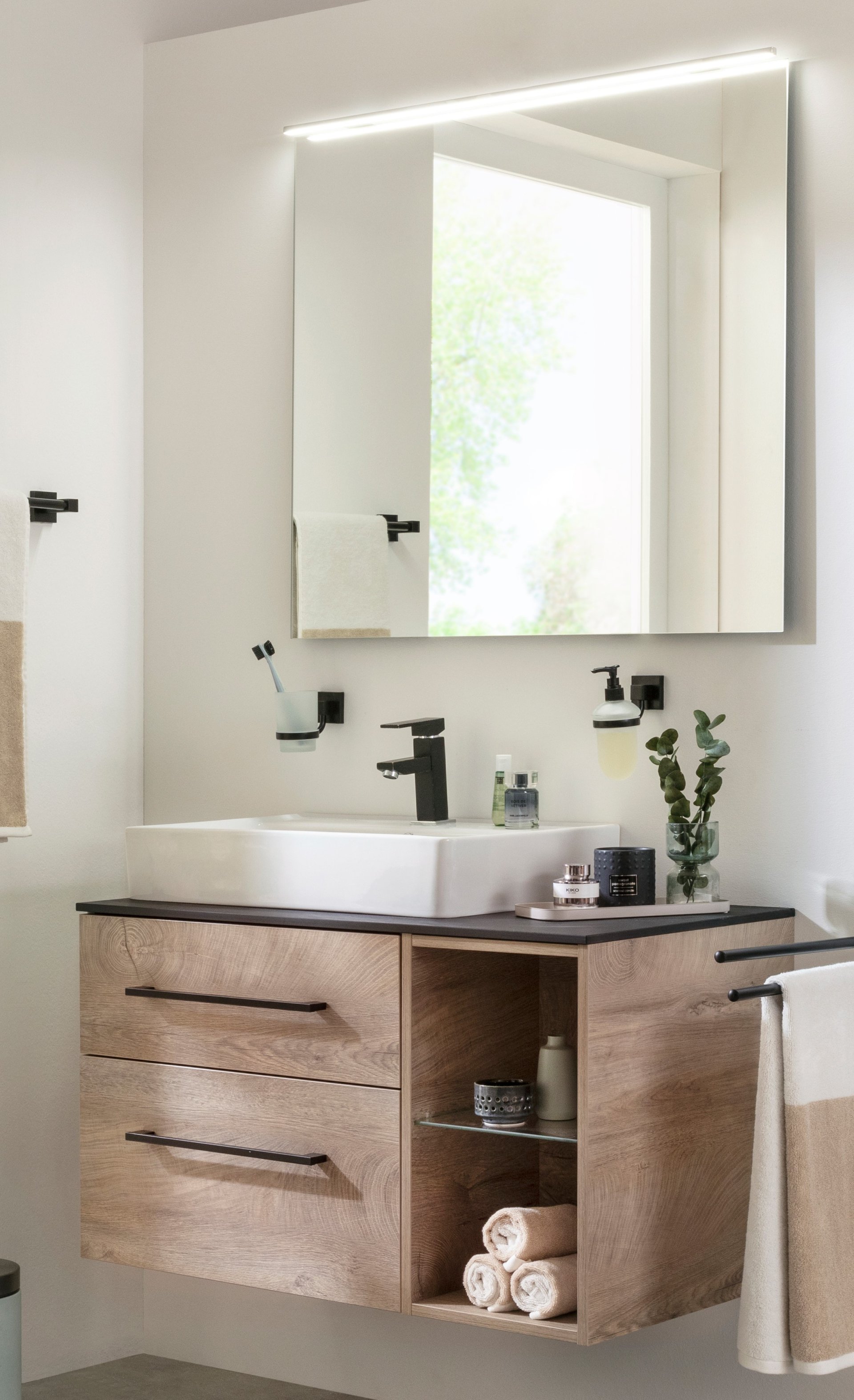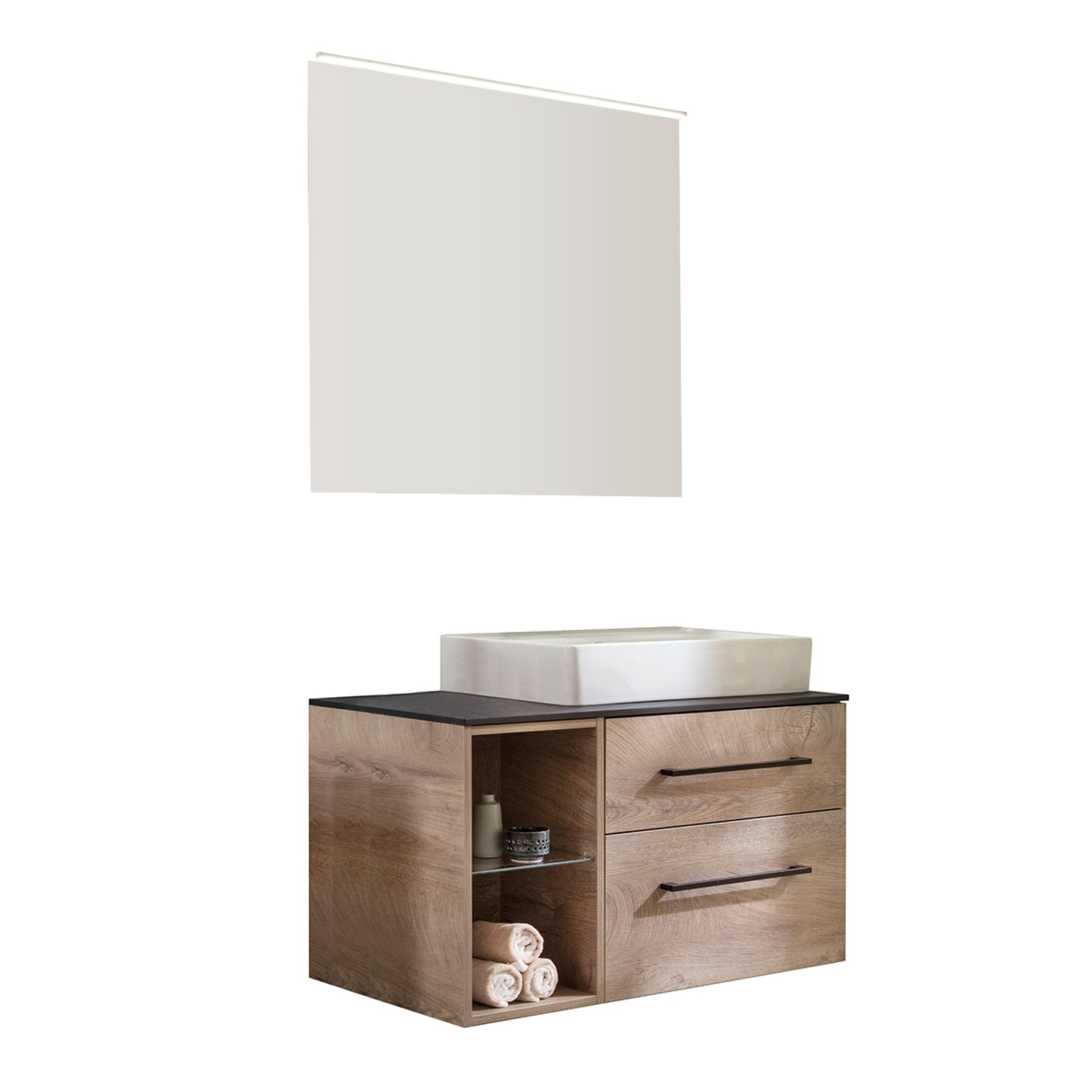 Ein schöner, großer Spiegel, optimal beleuchtet und dazu ein trendiges Badmöbel Set: Das bietet Dir das 6-teiligen Set aus der Serie OXFORD von Fackelmann. Die edle, schwarze High-Tech-Waschtischplatte mit einer Höhe von nur 12 mm verleiht dem Set Leichtigkeit und ist gleichzeitig ein außergewöhnlicher Blickfang. Der große Spiegel (Breite 90 cm) mit seiner extern schaltbaren LED Beleuchtung erzeugt Weite in Deinem Bad. Durch die Verwendung eines offenen Badregals auf der linken Seite des Badmöbel Sets ergibt sich eine Ablagefläche für die Dinge, die Du täglich benötigst. Im Badregal mit seinem Glaseinlegeboden sind Deine Badaccessoires griffbereit präsentiert. Eindrucksvoll ist das weiße Keramikwaschbecken auf der schwarzen Waschtischplatte. Durch die tiefe Waschmulde des Waschbeckens bleiben Wasserspritzer da, wo sie hingehören. Der Waschtischunterschrank verfügt über zwei Schubladen. Mit den beiden schwarzen Griffen lassen sich die Schubladen einfach öffnen und durch das Soft-Close System sanft schließen.