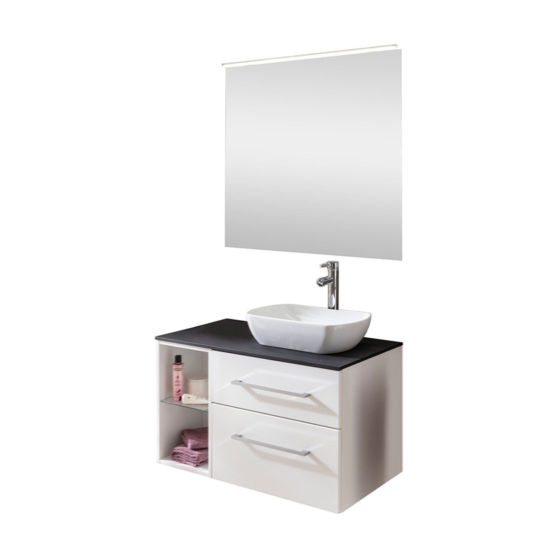 Alles komplett! Ein schöner, großer Spiegel, optimal beleuchtet und dazu ein trendiges Badmöbel Set: Das bietet Dir das 7-teilige Set aus der Serie OXFORD von Fackelmann. Die edle, schwarze High-Tech-Waschtischplatte mit einer Höhe von nur 12 mm verleiht dem Set Leichtigkeit und ist gleichzeitig ein außergewöhnlicher Blickfang. Der große Spiegel (Breite 90 cm) mit seiner extern schaltbaren LED Beleuchtung erzeugt Weite in Deinem Bad. Durch die Verwendung eines offenen Badregals auf der linken Seite des Badmöbel Sets ergibt sich eine Ablagefläche für die Dinge, die Du täglich benötigst. Im Badregal mit seinem Glaseinlegeboden sind Deine Badaccessoires griffbereit präsentiert. Eindrucksvoll ist das weiße formvollendete Aufsatzbecken auf der schwarzen Waschtischplatte. Durch die tiefe Waschmulde des Waschbeckens bleiben Wasserspritzer da, wo sie hingehören. Der Waschtischunterschrank verfügt über zwei Schubladen. Mit den beiden verchromten Griffen lassen sich die Schubladen einfach öffnen und durch das Soft-Close System sanft schließen. Mit viel Liebe zum Detail werden die Möbel in Deutschland hergestellt. Sie werden zerlegt und mit einer leicht verständlichen Anleitung zum Selbstaufbau geliefert. So ist Dein neues modernes Fackelmann OXFORD Badmöbelset 7-teilig, 90 cm, Weiß, Keramikschüssel rasch in Deinem Badezimmer integriert.