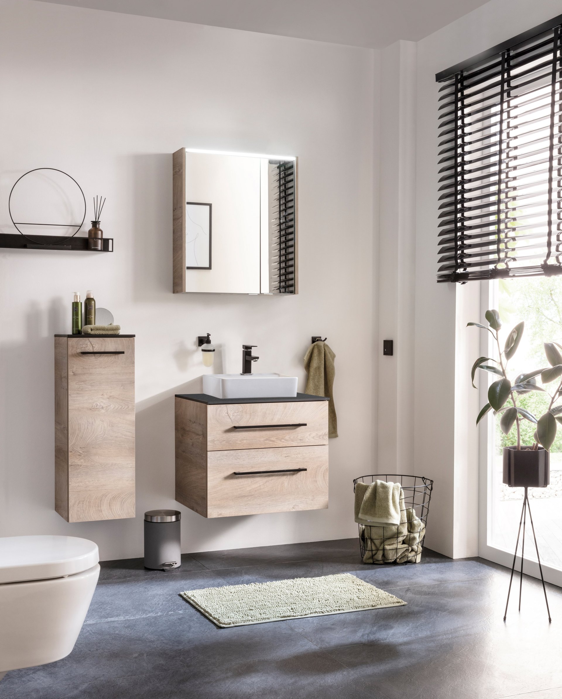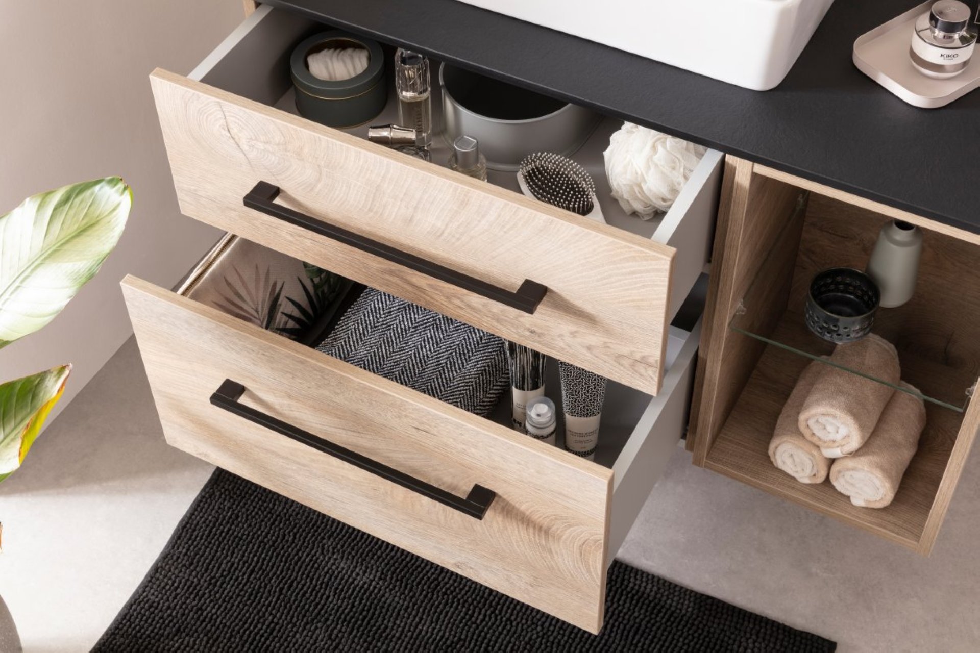 Viele Beckenalternativen! Und dazu eine exklusive, dünne Waschtischplatte in Schieferstruktur in Breiten von 60 - 150 cm. Diese Möglichkeiten bietet Dir der moderne Waschtischunterschrank aus der Serie OXFORD von Fackelmann! Deiner Kreativität sind keine Grenzen gesetzt. Egal ob rundes, eckiges oder ovales Aufsatzbecken, auf der hochwertigen, schwarzen Waschtischplatte machen alle Varianten einen guten Eindruck. Helles Braun, dem Farbspiel der Eiche nachempfunden, zeichnen den Waschtischunterschrank aus der Serie OXFORD von Fackelmann aus. Er ist ein Garant für Ordnung in Deinem Badezimmer. Mit seinen beiden Schubladen sorgt der Waschbeckenunterschrank für ausreichend Stauraum in Deinem Bad. So sind Handtücher, Kosmetikartikel und viele andere Badaccessoire gut aufgeräumt und ordentlich verstaut. Und das Gute daran: Auf einen Blick ist alles griffbereit. Der Unterschrank für Waschtische von Fackelmann hat eine Breite von 60 cm und lässt sich mit dem hellbraunen (Nature Oak) Regal mit Glaseinlegeboden stilvoll ergänzen. Mit dem Griff in mattem Schwarz ist er leicht zu öffnen. Sanftes Schließen garantieren die gedämpften Scharniere. Der Fackelmann OXFORD Waschbeckenunterschrank 60 cm breit, Braun hell wird für Dich in Deutschland hergestellt und ist zerlegt. Eine einfache und leicht verständliche Aufbauanleitung hilft Dir beim Zusammenbau.