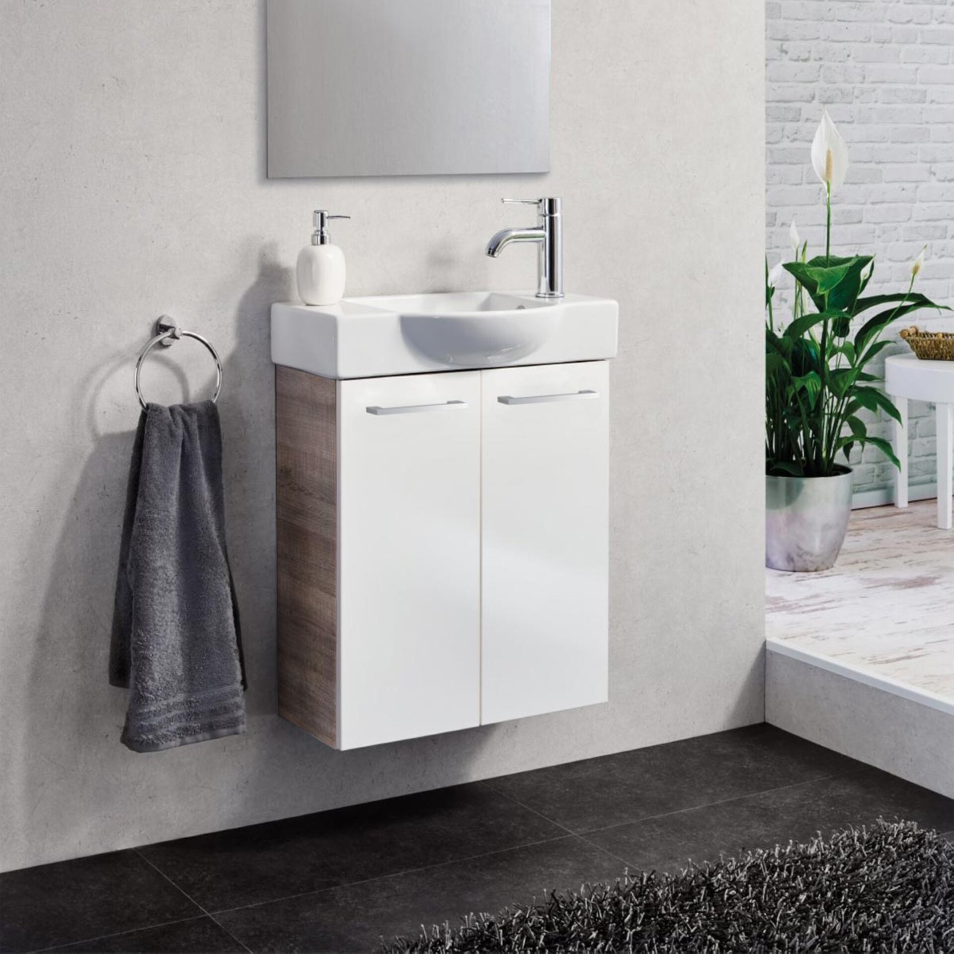 Der Waschtischunterschrank in einem hellen Braunton mit weißen Türen von Fackelmann aus der Serie SBC A-VERO ist ideal für Dein Gäste-WC geeignet. Fackelmann präsentiert mit SBC A-VERO ein trendiges Badprogramm. Die außergewöhnliche Optik der Fronten und Korpusse wird Dich begeistern. Durch die sägeraue Oberfläche wird man an die natürliche Struktur von Eichenholz erinnert. Der Waschbeckenunterschrank ist mit zwei Türen und gedämpften Scharnieren ausgestattet, die ein sanftes Schließen gewährleisten. Auf den Fackelmann SBC A-VERO Waschbeckenunterschrank 55 cm, Braun hell/Weiß, 2 Türen passt unter anderem das Fackelmann Becken mit der Art.Nr. 82392. Mit viel Liebe zum Detail werden die Badmöbel von Fackelmann in Deutschland hergestellt. Der Unterschrank ist vormontiert und damit schnell in Deinem Badezimmer aufgestellt.