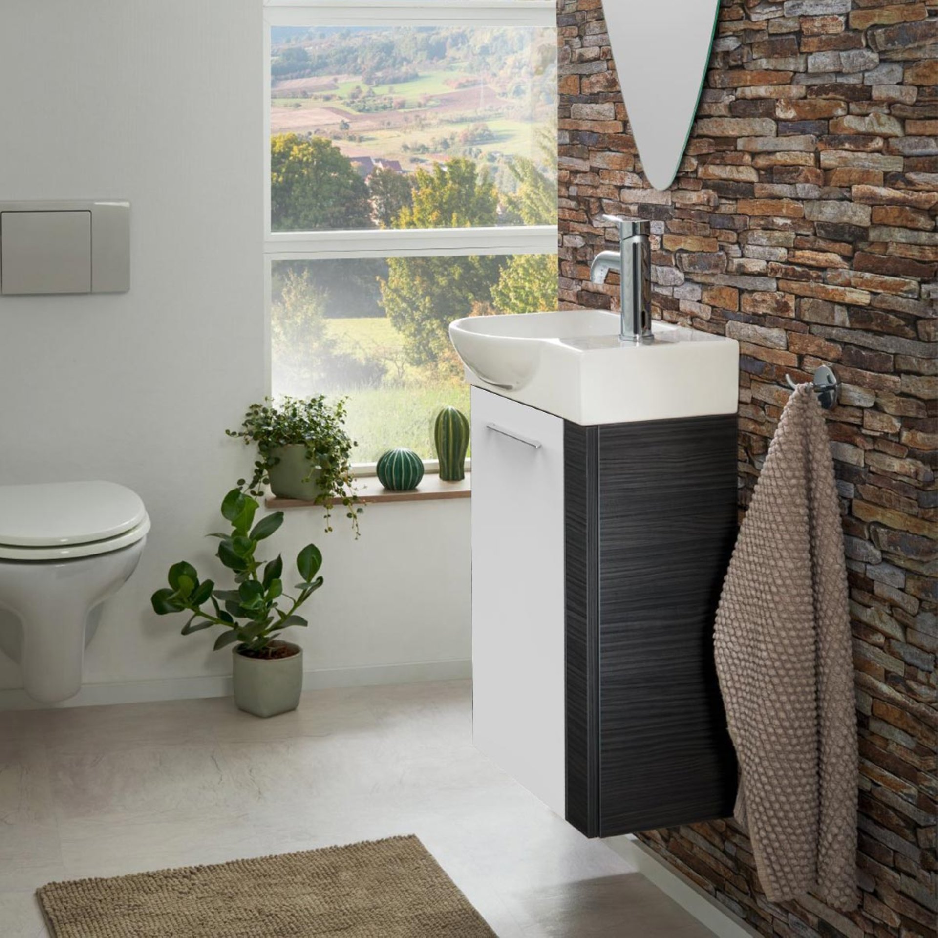 Die perfekte Lösung für Dein Gästebad: der Waschbeckenunterschrank SBC B.PERFEKT von Fackelmann bringt Design und Ordnung in die Badeinrichtung. Die Kombination aus einem anthrazitfarbenen Korpus im Design der Eiche und einer weiß-glänzenden Front erzeugt eine angenehme Atmosphäre. Aufgrund seiner Breite von nur 44 cm ist der Badezimmerschrank sehr schmal und damit ideal für kleine Bäder und Gäste-WCs geeignet. Platzprobleme im kleinen Badezimmer gehören ab sofort der Vergangenheit an, denn der Fackelmann SBC B. PERFEKT Waschbeckenunterschrank 45 cm, Anthrazit Holzoptik/Weiß, links nutzt den vorhandenen Raum unter dem Waschbecken optimal aus und bietet auf einem Einlageboden Stauraum für Badutensilien und Accessoires. Der Schrank verfügt über eine links angeschlagene Tür, welche sich aufgrund der gedämpften Scharniere besonders sanft schließen lässt. Dank der vormontierten Lieferung ist der Schrank leicht in Deinem Bad integriert. Das dazu passende Waschbecken ist aus Keramik (Art.Nr. 82390) oder Glas (Art.Nr. 82397 und 82407). Das Glasbecken kann zusätzlich mit dem BackLight Mini (Art.Nr. 86301) indirekt beleuchtet werden. Waschtisch und Beleuchtung sind nicht im Lieferumfang enthalten und separat hier bei BadeDu erhältlich. Der Fackelmann SBC B. PERFEKT Waschbeckenunterschrank 45 cm, Anthrazit Holzoptik/Weiß, links wird mit viel Liebe zum Detail in Deutschland hergestellt.
