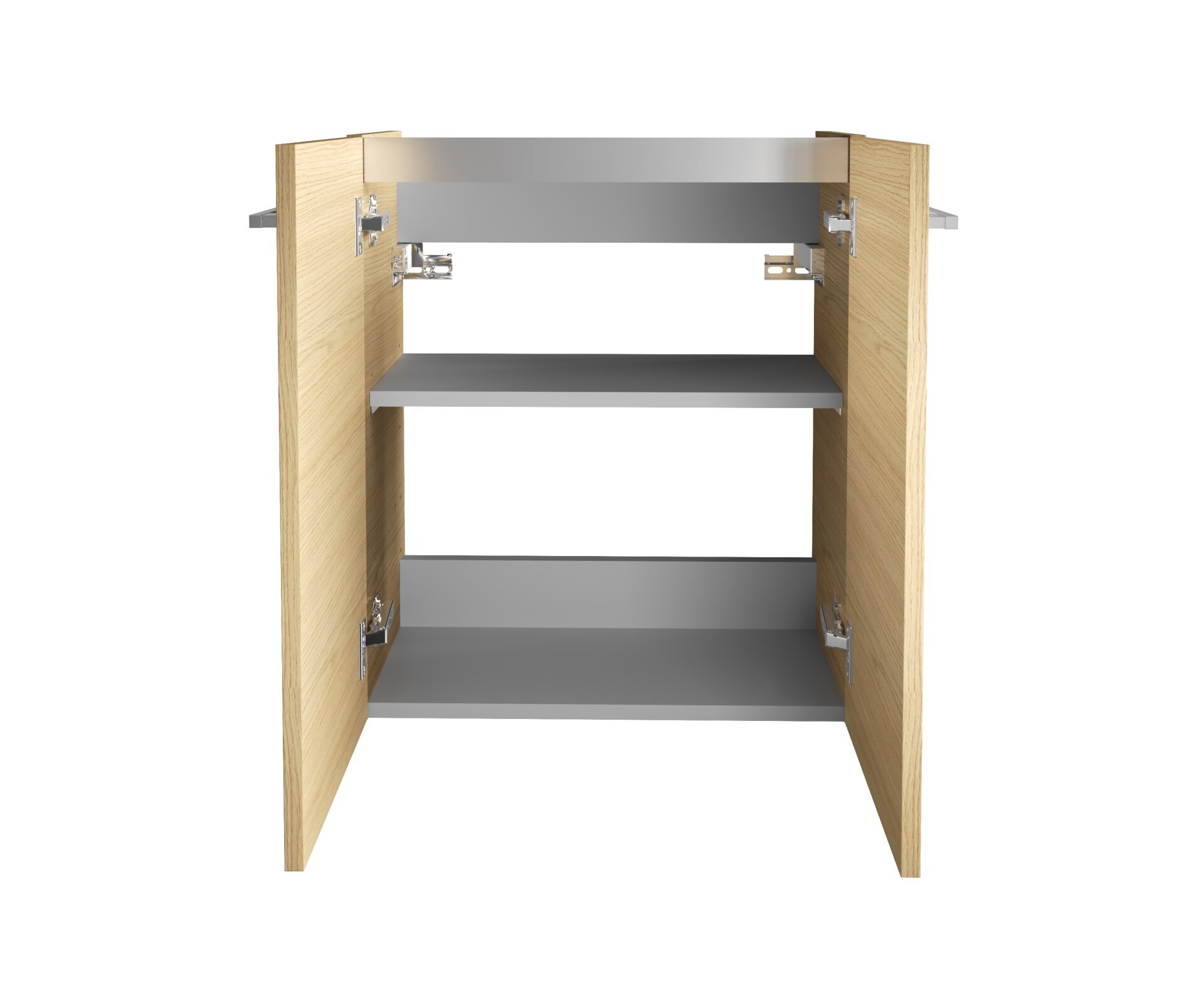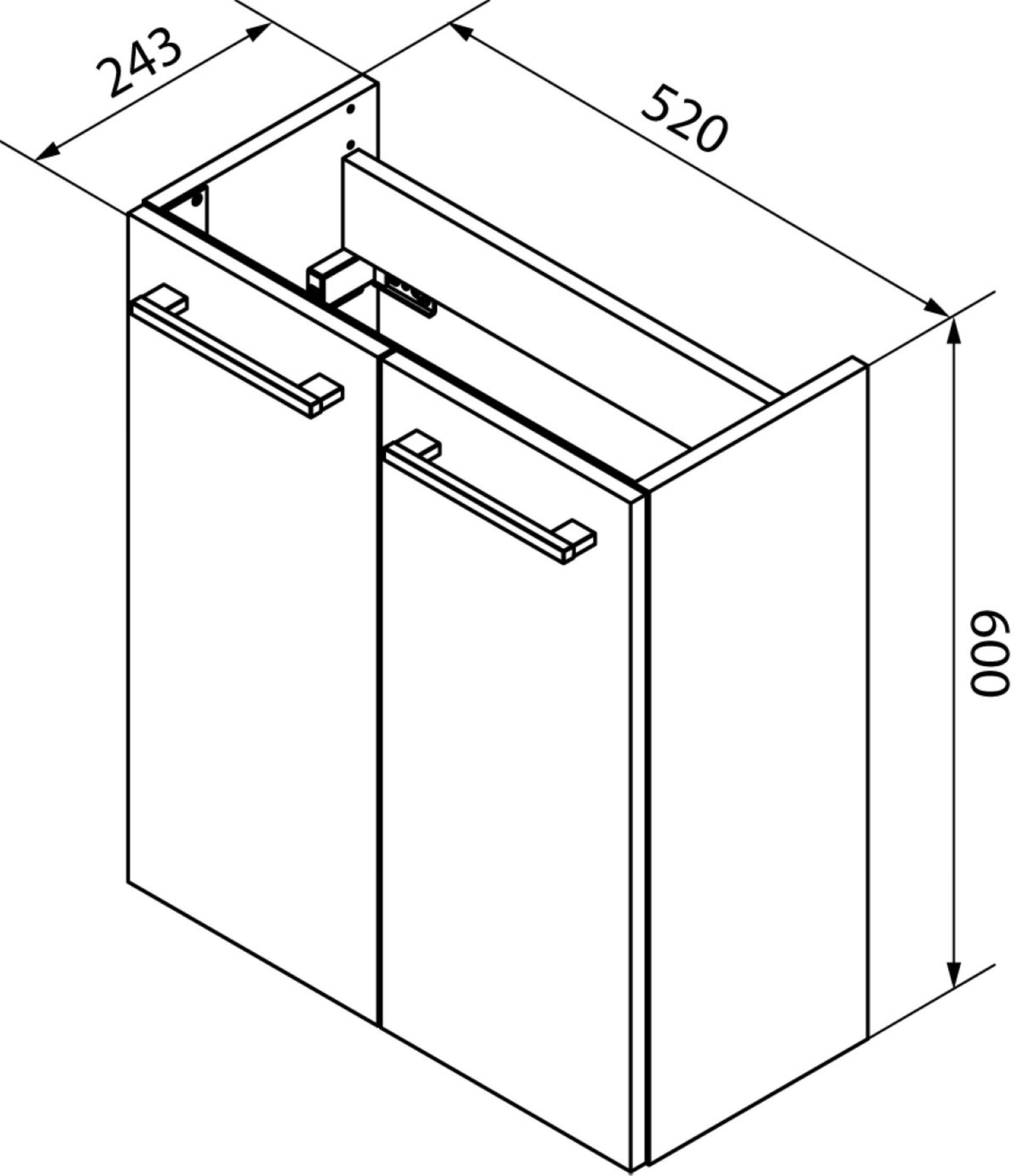 - Ausstattung: 2 Türen, 1 Einlegeboden, gedämpfte Scharniere, Griffe Chrom glänzend