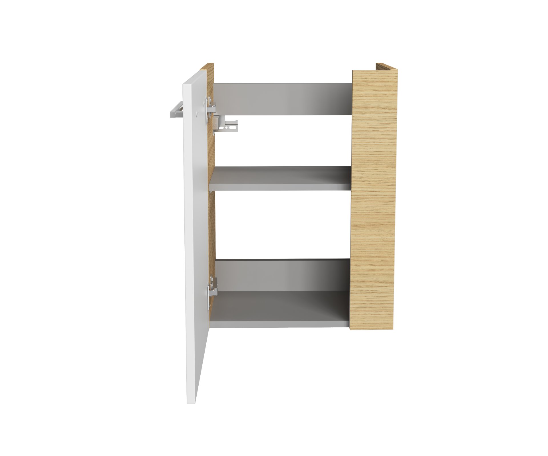 - Ausstattung: 1 Tür (links), 1 Einlegeboden, gedämpfte Scharniere, Griff Chrom glänzend