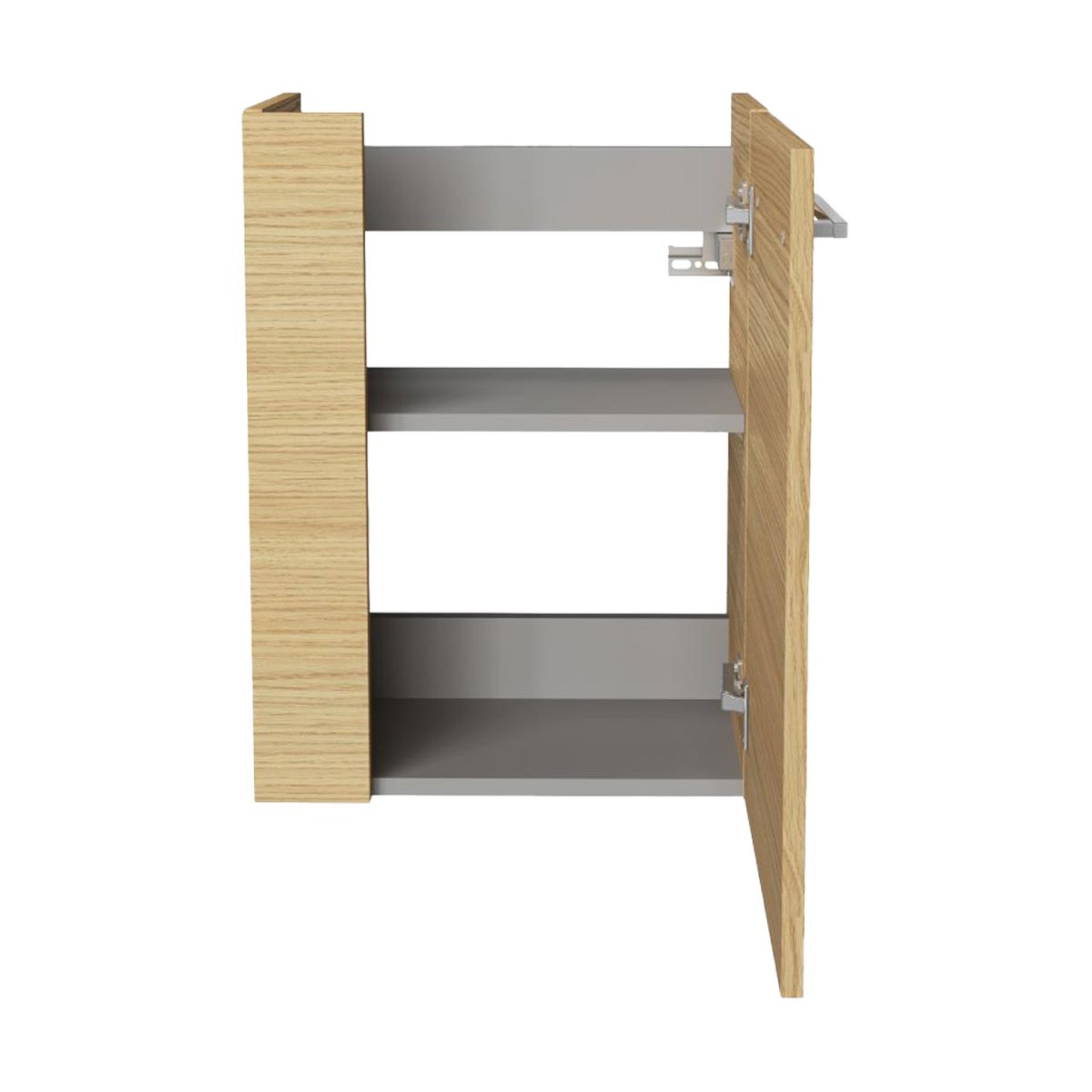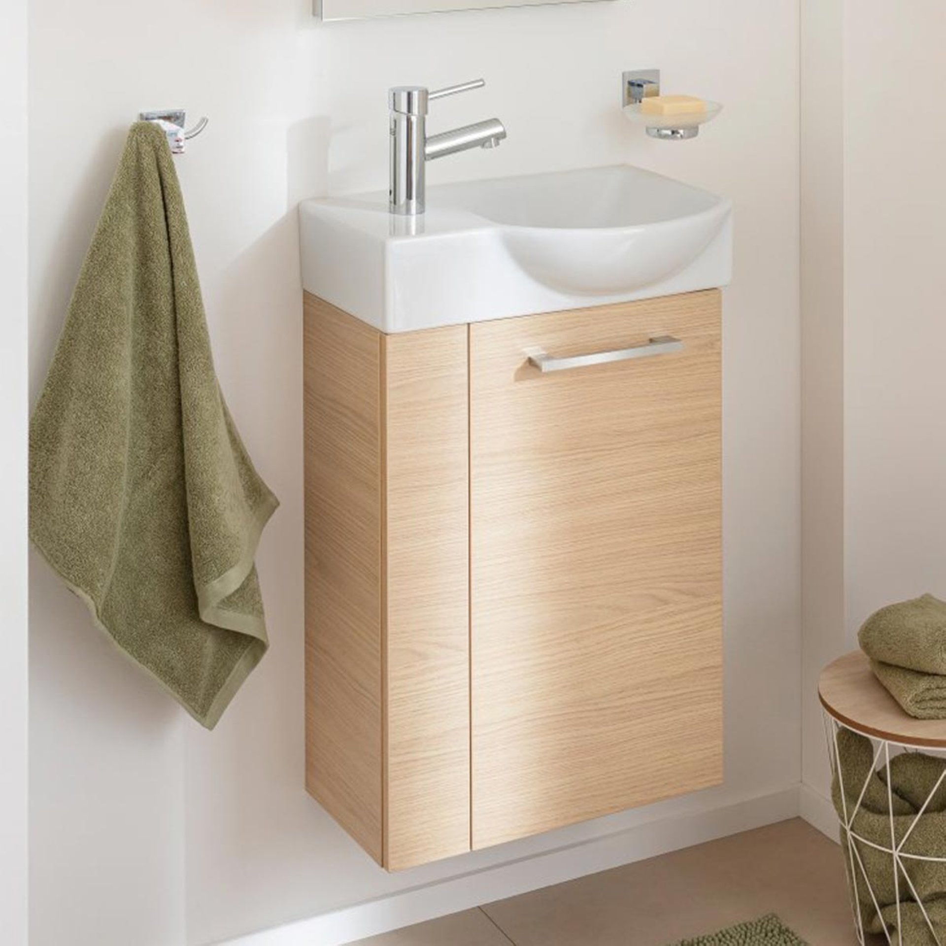 Freundlich und einladend wirkt der Waschbeckenunterschrank SBC B.STYLE von Fackelmann. Die hellbraune Holzoptik erinnert an den warmen Holzton der Eiche und sorgt so für eine absolute Wohlfühl-Atmosphäre. Aufgrund seiner Breite von nur 44 cm ist der Badezimmerschrank sehr schmal und damit ideal für kleine Bäder und Gäste-WCs geeignet. Platzprobleme im kleinen Badezimmer gehören ab sofort der Vergangenheit an, denn der Fackelmann SBC B. STYLE Waschbeckenunterschrank 45 cm, Braun hell, rechts nutzt den vorhandenen Raum unter dem Waschbecken optimal aus und bietet auf einem Einlageboden Stauraum für Badutensilien und Accessoires. Der Schrank verfügt über eine rechts angeschlagene Tür, welche sich aufgrund der gedämpften Scharniere besonders sanft schließen lässt. Dank der vormontierten Lieferung ist der Schrank leicht in Deinem Bad integriert. Das dazu passende Waschbecken ist aus Keramik (Art.Nr. 82390) oder Glas (Art.Nr. 82397 und 82407). Das Glasbecken kann zusätzlich mit dem BackLight Mini (Art.Nr. 86301) indirekt beleuchtet werden. Waschtisch und Beleuchtung sind nicht im Lieferumfang enthalten und separat hier bei BadeDu erhältlich.