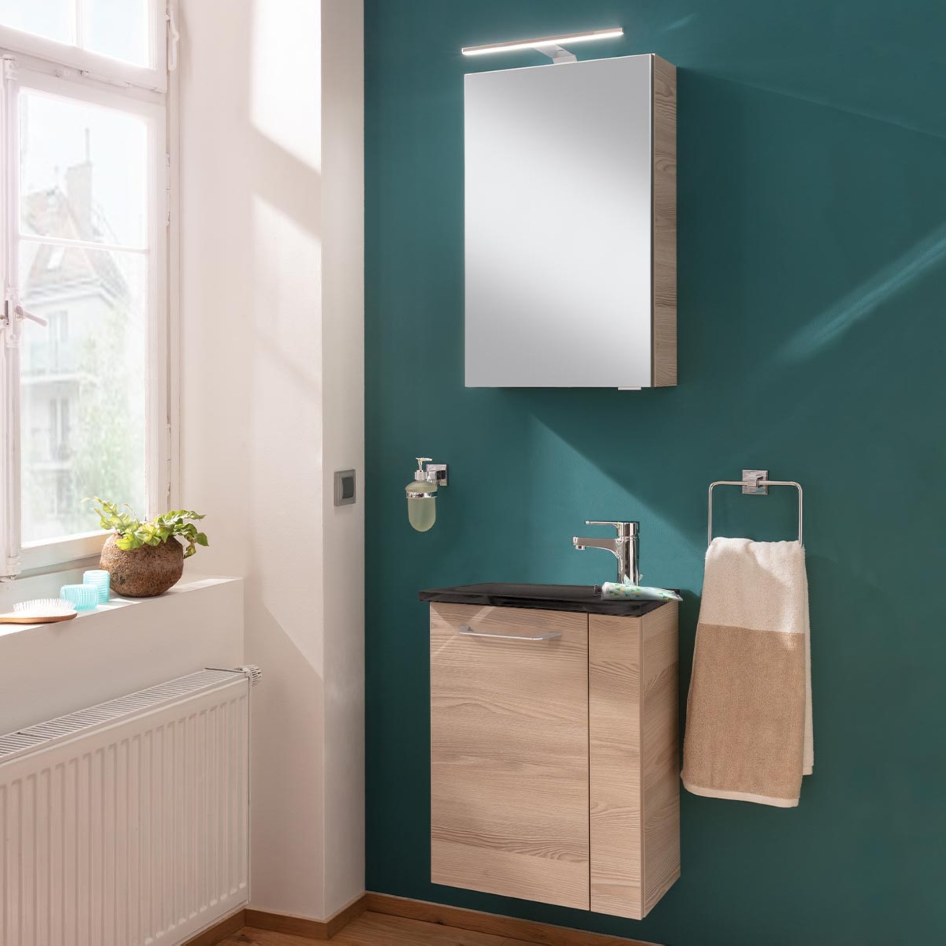 Fackelmann SBC B.CLEVER Gäste WC Waschtisch Set 45 cm breit, Braun hell, Waschbecken Glas Anthrazit, Türanschlag links