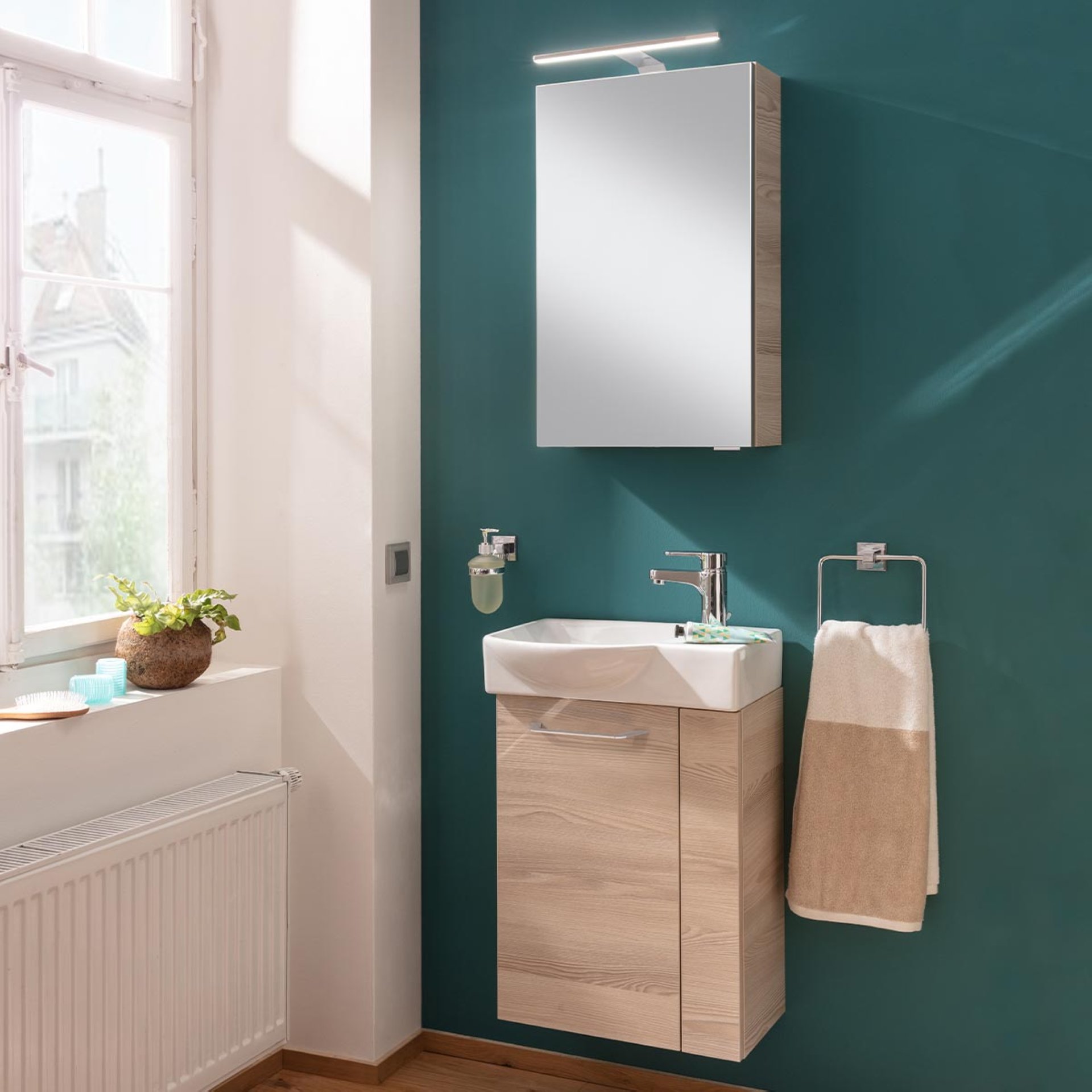 Das 2-teilige Gäste-WC-Set aus der Serie SBC B.CLEVER von Fackelmann passt hervorragend in kleine Bäder und Gäste-WCs. Der hellbraune Waschbeckenunterschrank ist vollständig in natürlicher Holzoptik gehalten und sorgt so für eine wohnliche Atmosphäre. Hinter der links angeschlagenen Tür bringt ein Einlegeboden Ordnung in die kleinen Dinge Deines Bades. Auf der rechten Seite des Waschbeckens aus weißer Keramik befindet sich die Armatur. Ein echter Hingucker ist die abgerundete Waschmulde, die dem Badezimmer Eleganz verleiht. Mit viel Liebe zum Detail werden die Möbel von Fackelmann in Deutschland hergestellt. Das praktische Fackelmann SBC B. CLEVER Gäste WC Set 2-teilig 45 cm, Braun hell, links, Keramik Hahnloch rechts ist vormontiert und kann so schnell und einfach in Dein Badezimmer einziehen.