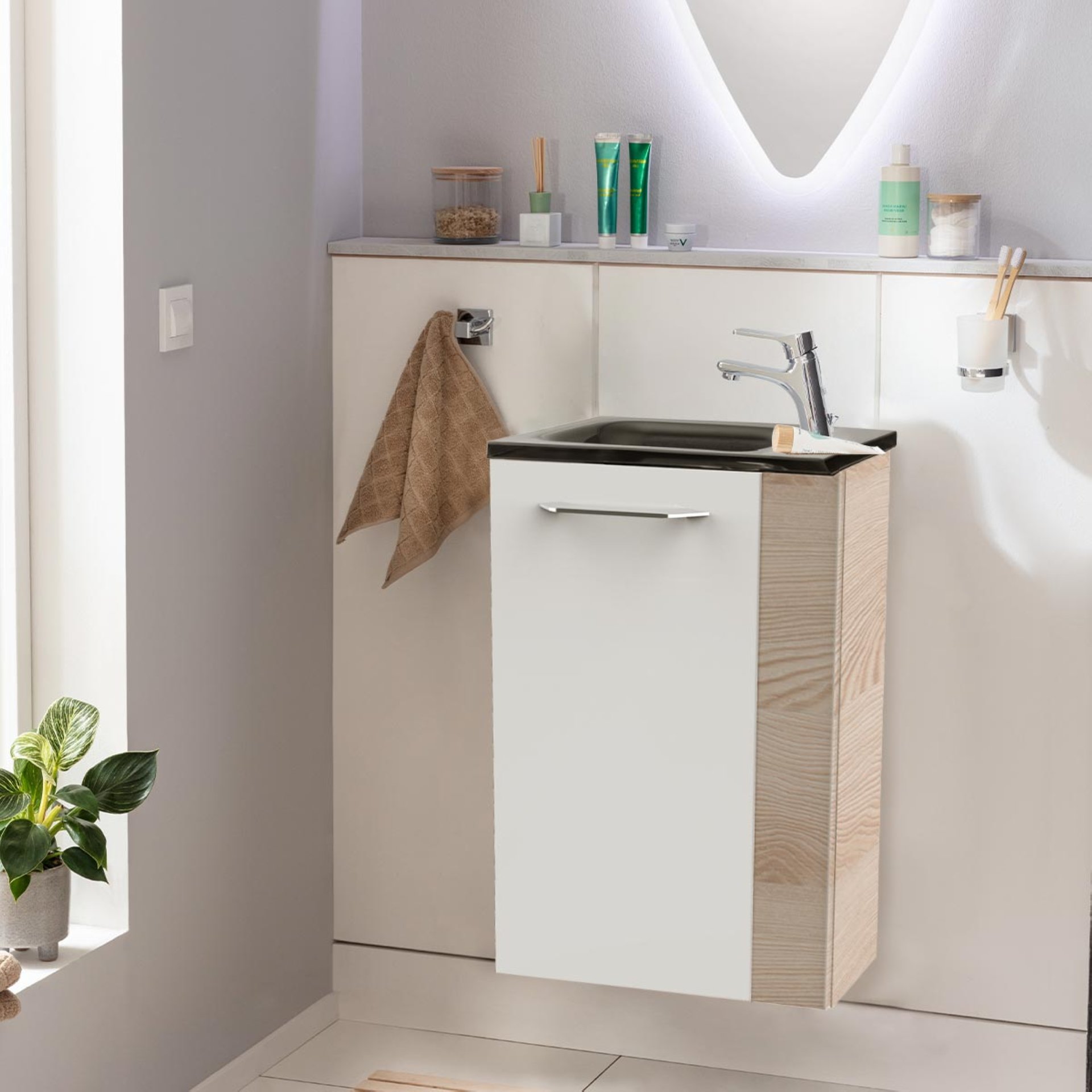 Fackelmann SBC B.CLEVER Gäste WC Waschtisch Set 45 cm breit, Weiß/Braun hell, Waschbecken Glas Anthrazit, Türanschlag links