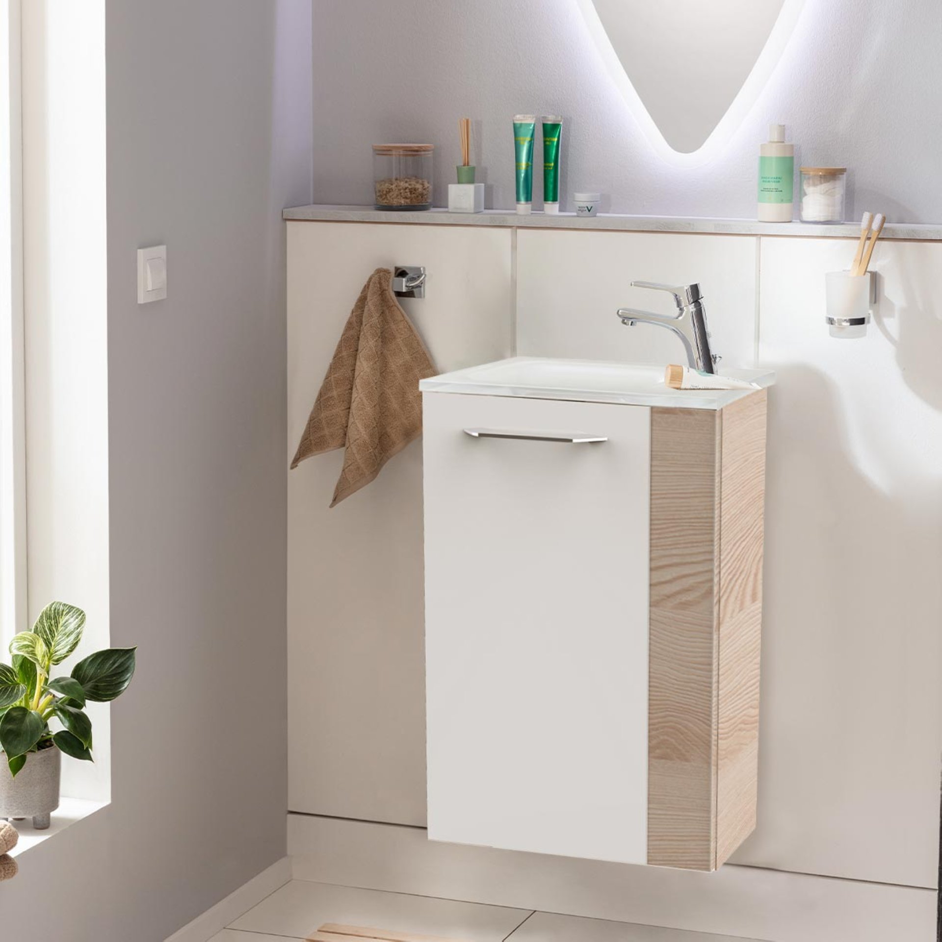 Fackelmann SBC B.CLEVER Gäste WC Waschtisch Set 45 cm breit, Weiß/Braun hell, Waschbecken Glas Weiß, Türanschlag links