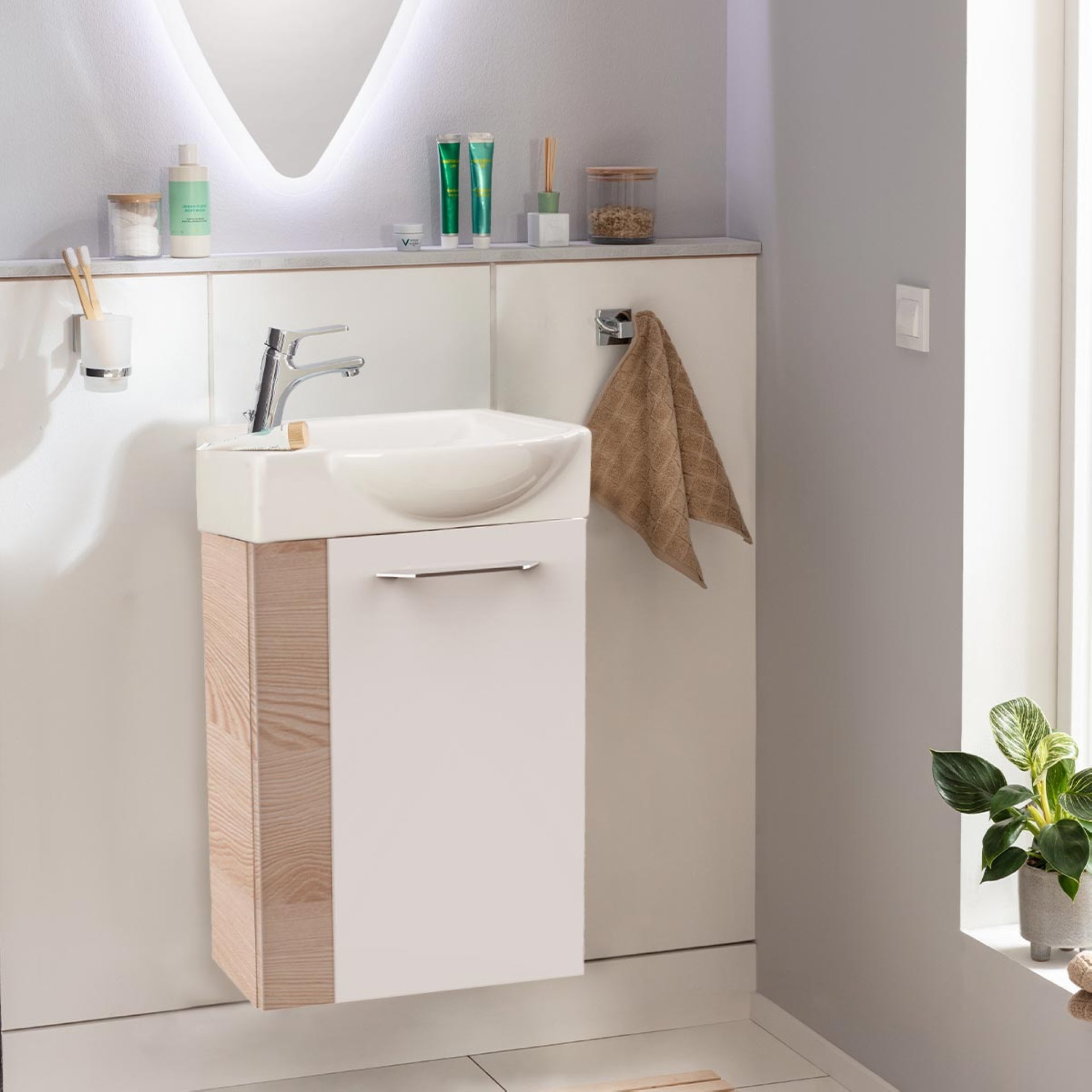 Fackelmann SBC B.CLEVER Gäste WC Waschtisch Set 45 cm breit, Weiß/Braun hell, Waschbecken Keramik Weiß, Türanschlag rechts