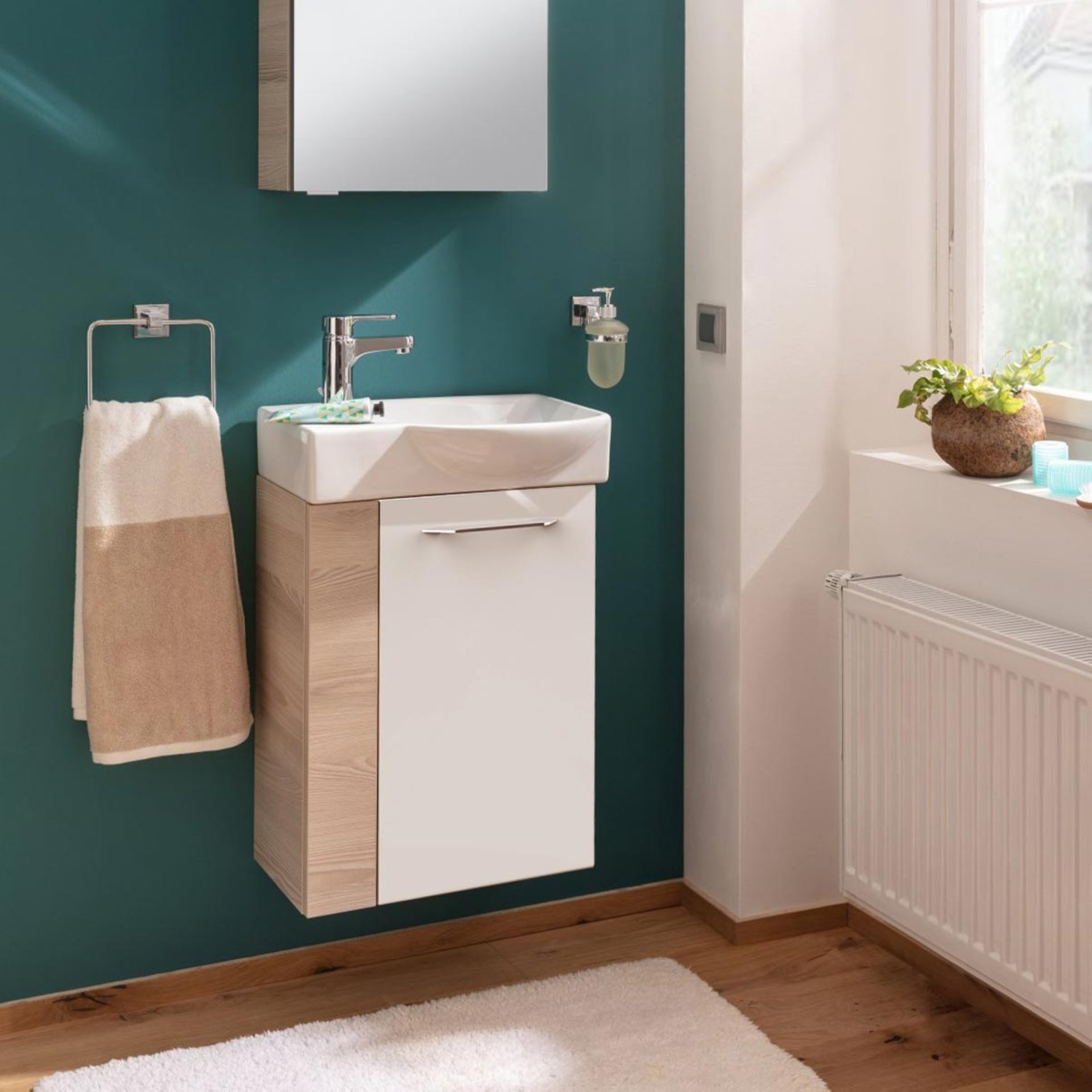 Die clevere Lösung für Dein Gästebad: der Waschbeckenunterschrank SBC B.CLEVER von Fackelmann bringt Design und Ordnung in die Badeinrichtung. Die Kombination aus einem hellbraunen Korpus im Design der Alaska-Esche und einer weiß-glänzenden Front erzeugt eine angenehme Atmosphäre. Aufgrund seiner Breite von nur 44 cm ist der Badezimmerschrank sehr schmal und damit ideal für kleine Bäder und Gäste-WCs geeignet. Platzprobleme im kleinen Badezimmer gehören ab sofort der Vergangenheit an, denn der Fackelmann SBC B.CLEVER Waschbeckenunterschrank 45 cm, Braun hell/Weiß, rechts nutzt den vorhandenen Raum unter dem Waschbecken optimal aus und bietet auf einem Einlageboden Stauraum für Badutensilien und Accessoires. Der Schrank verfügt über eine rechts angeschlagene Tür, welche sich aufgrund der gedämpften Scharniere besonders sanft schließen lässt. Dank der vormontierten Lieferung ist der Schrank leicht in Deinem Bad integriert. Das dazu passende Waschbecken ist aus Keramik (Art.Nr. 82390) oder Glas (Art.Nr. 82397 und 82407). Das Glasbecken kann zusätzlich mit dem BackLight Mini (Art.Nr. 86301) indirekt beleuchtet werden. Waschtisch und Beleuchtung sind nicht im Lieferumfang enthalten und separat hier bei BadeDu erhältlich.