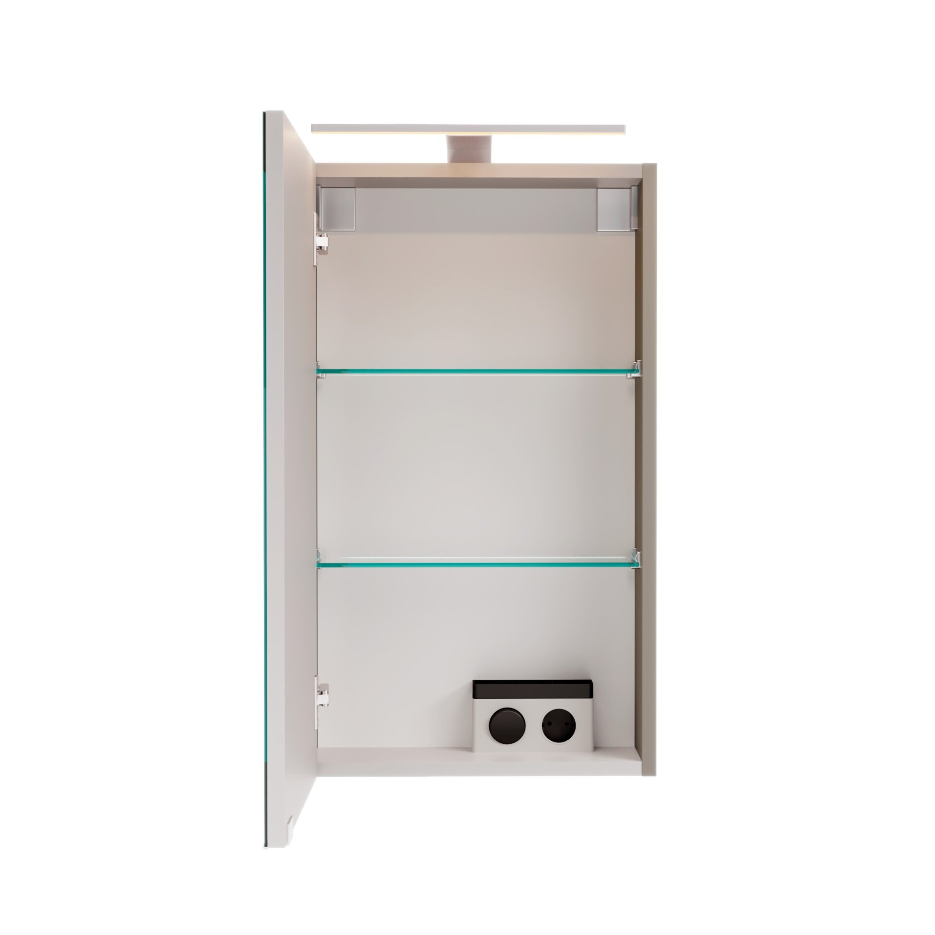 - Ausstattung: 1 Tür, LED-Aufsatzleuchte (3,3W), 2 Glaseinlegeböden, E-Box, Schalter, Kabellänge 0,8m
