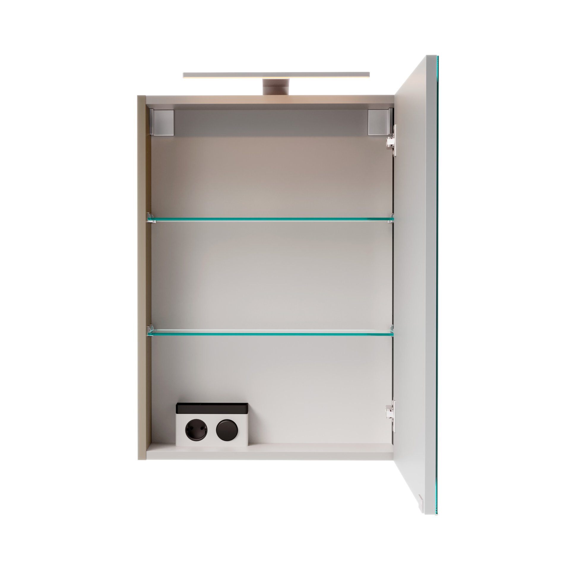 - Ausstattung: 1 Tür, LED-Aufsatzleuchte (3,3W), 2 Glaseinlegeböden, E-Box, Schalter, Kabellänge 0,8m