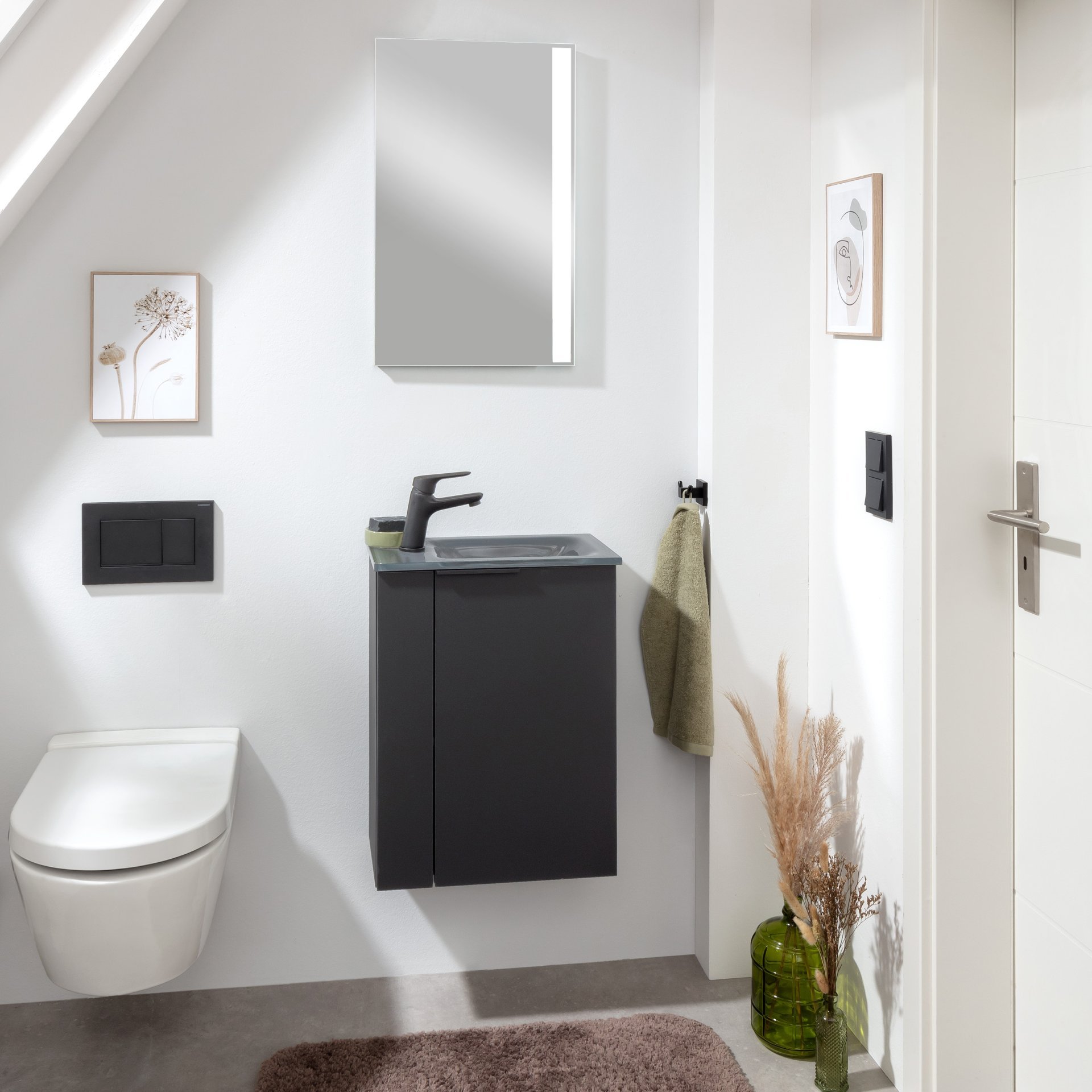 Die schwarze matte Oberfläche des 44 cm breiten Waschbeckenunterschranks aus der Serie B.PARIS von Fackelmann, verleiht Deinem Bad einen schicken Look. Er passt gut zu modernen Einrichtungsstilen in Gäste WC's oder kleinen Bädern. Das Design des Badschranks ist durchdacht und funktional. Der Unterschrank verfügt über eine Tür mit rechtem Türanschlag. In seinem Inneren befindet sich ein Einlegeboden, der für eine praktische Aufteilung sorgt. So sind Deine Badaccessoires aufgeräumt und immer griffbereit. Badmöbel von Fackelmann werden mit viel Liebe zum Detail in Deutschland hergestellt. Der Fackelmann SBC B.PARIS Waschbeckenunterschrank 45 cm, Schwarz matt, rechts ist vormontiert und damit schnell in Deinem Bad integriert.