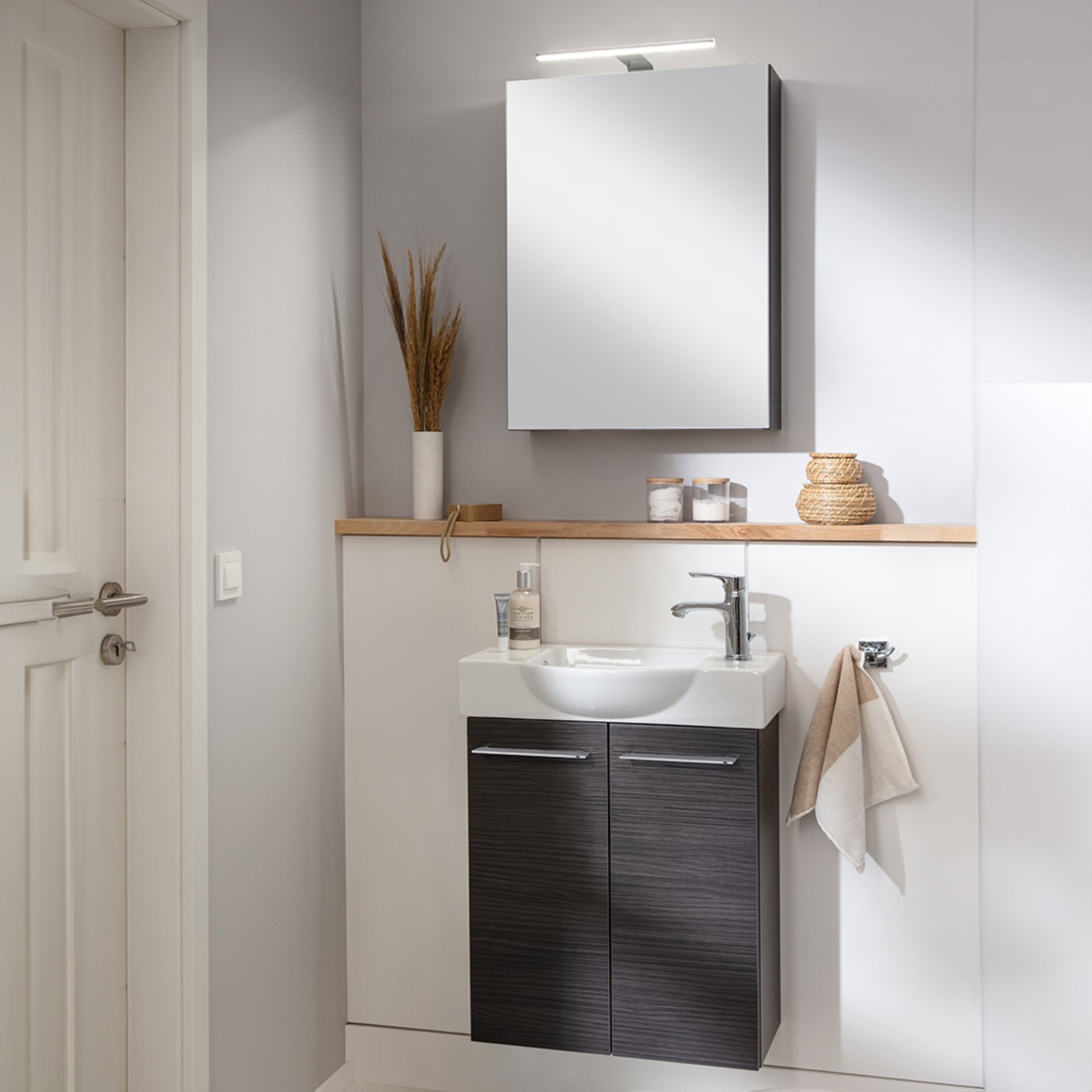Eleganz und starke Kontraste im kleinen Badezimmer oder Gäste-WC – mit dem 3-teiligen Gäste-WC-Set B.PERFEKT von Fackelmann. Das 55 cm breite Set besteht aus einem Waschtischunterschrank in anthrazitfarbener Holzoptik, einem Waschbecken aus weißer Keramik sowie einem 50 cm breiten Spiegelschrank. Besonders wichtig in kleinen Bädern: Den vorhandenen Platz optimal ausnutzen. Genau das macht der Waschbeckenunterschrank, denn hinter seinen beiden Türen verbirgt sich viel Stauraum für die wichtigsten Badutensilien im Gästebad. Der Unterschrank strahlt mit der dunklen Holzoptik Exklusivität und Eleganz aus. Ansprechende Kontraste schafft das weiße Keramikwaschbecken, wobei die geschwungene Waschmulde ein echter Blickfang ist. Auf der rechten Seite bietet ein vorgebohrtes Hahnloch Platz für die Armatur. Die Krönung des Badsets ist der Spiegelschrank. Mit dem kleinen unauffälligen Griff lässt sich die Tür des Spiegelschranks mit rechtem Türanschlag einfach und leicht öffnen. Bei geöffneter Tür offenbart sich im Inneren des Schranks eine praktische Unterteilung mit zwei Glaseinlegeböden. Mit viel Liebe zum Detail werden die Badmöbel von Fackelmann in Deutschland hergestellt. Das FACKELMANN SBC B.PERFEKT Gäste WC Waschtisch Set mit Spiegelschrank 55 cm breit, Anthrazit, Türanschlag rechts ist vormontiert und kann damit schnell und einfach in Dein Badezimmer einziehen.