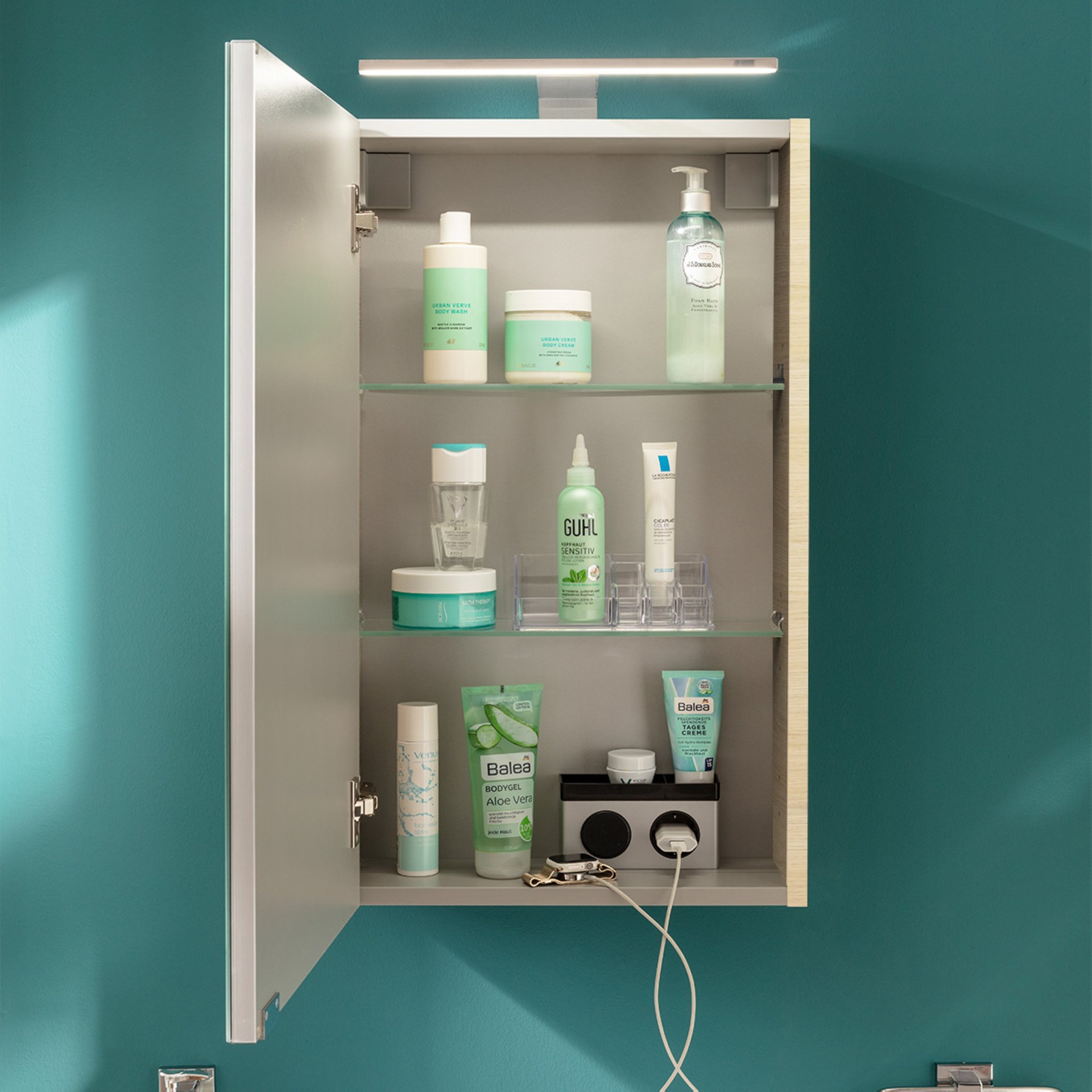 Hinter der Bezeichnung Sandeiche verbirgt sich ein helles Eichenholz mit einer besonders edlen Optik. Dieser Farbton findet beim Korpus seine Verwendung. Dadurch wirkt der 40 cm breite Spiegelschrank aus der Serie B.STYLE von Fackelmann elegant und stilvoll in Deinem Badezimmer. Mit dem kleinen unauffälligen Griff lässt sich der Schrank einfach und leicht öffnen. Bei geöffneter Tür mit linkem Türanschlag offenbart sich im Inneren eine praktische Unterteilung mit zwei Glaseinlegeböden. Ausreichend Platz für all die Accessoires, die man in kleinen Bädern oder Gäste WC's benötigt. Zusätzlich befindet sich im unteren Fach des modernen Spiegelschrank eine Elektrobox mit Schalter und Steckdose. Praktisch für alle Elektrogeräte, wie Fön, elektrische Zahnbürste oder Lockenstab. Die verchromte LED-Leuchte beleuchtet Dein Spiegelbild optimal für das tägliche Pflegeritual. Mit viel Liebe zum Detail werden Badmöbel von Fackelmann in Deutschland hergestellt. Der Fackelmann SBC B.STYLE Gäste-WC Spiegelschrank 40 cm, Braun hell, links ist vormontiert und damit schnell in Deinem Bad integriert.