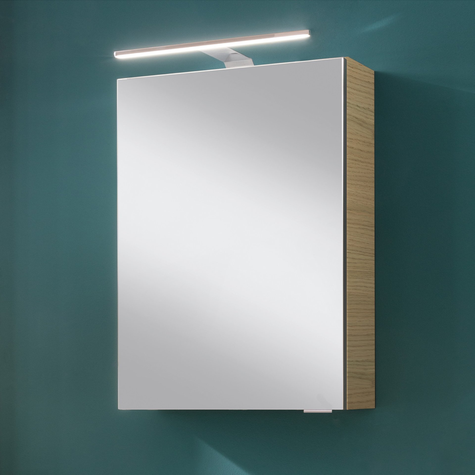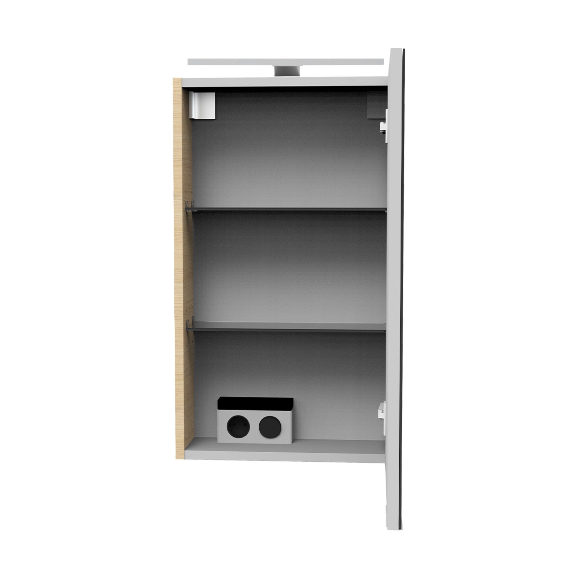 Hinter der Bezeichnung Sandeiche verbirgt sich ein helles Eichenholz mit einer besonders edlen Optik. Dieser Farbton findet beim Korpus seine Verwendung. Dadurch wirkt der 40 cm breite Spiegelschrank aus der Serie B.STYLE von Fackelmann elegant und stilvoll in Deinem Badezimmer. Mit dem kleinen unauffälligen Griff lässt sich der Schrank einfach und leicht öffnen. Bei geöffneter Tür mit rechtem Türanschlag offenbart sich im Inneren eine praktische Unterteilung mit zwei Glaseinlegeböden. Ausreichend Platz für all die Accessoires, die man in kleinen Bädern oder Gäste WC's benötigt. Zusätzlich befindet sich im unteren Fach des modernen Spiegelschrank eine Elektrobox mit Schalter und Steckdose. Praktisch für alle Elektrogeräte, wie Fön, elektrische Zahnbürste oder Lockenstab. Die verchromte LED-Leuchte beleuchtet Dein Spiegelbild optimal für das tägliche Pflegeritual. Mit viel Liebe zum Detail werden Badmöbel von Fackelmann in Deutschland hergestellt. Der Fackelmann SBC B.STYLE Gäste-WC Spiegelschrank 40 cm, Braun hell, rechts ist vormontiert und damit schnell in Deinem Bad integriert.