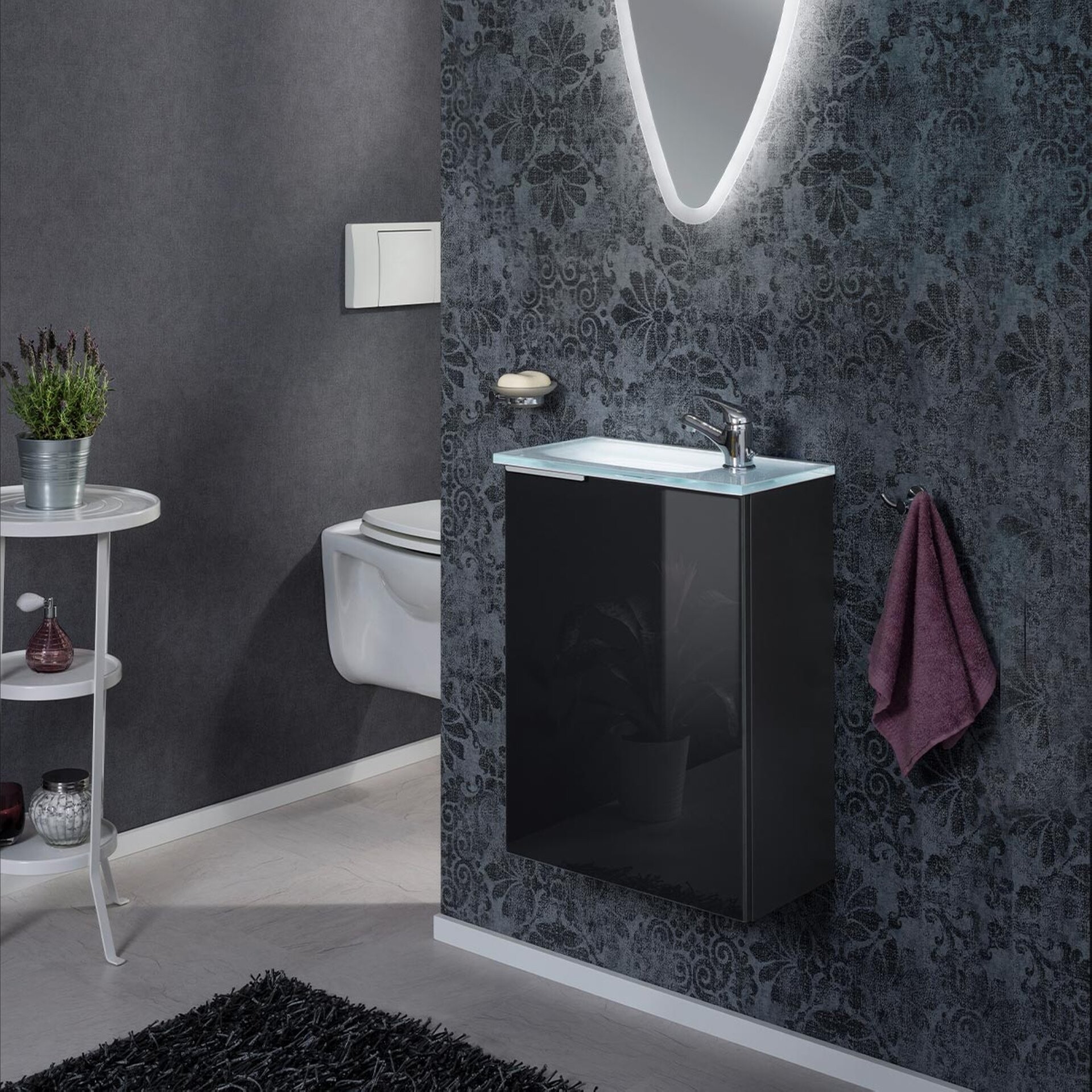 Das 3-teilige Gäste-WC-Set aus der Serie KARA von Fackelmann passt hervorragend in kleine Bäder und Gäste-WCs. Der Waschbeckenunterschrank in der Trendfarbe Anthrazit strahlt mit seiner gläsernen Front Exklusivität und Eleganz aus. Hinter der rechts angeschlagenen Tür bringt ein Einlegeboden Ordnung in die kleinen Dinge Deines Bades. Beeindruckende Kontraste erzeugt das weiße Waschbecken aus Glas. Hinter dem Waschbecken setzt eine LED-Waschbeckenbeleuchtung den Waschplatz in Szene. Mit viel Liebe zum Detail werden die Möbel von Fackelmann in Deutschland hergestellt. Das praktische Fackelmann SBC KARA Gäste WC Set 3-teilig 45 cm, Anthrazit, rechts, Glas Weiß ist vormontiert und kann so schnell und einfach in Dein Badezimmer einziehen.