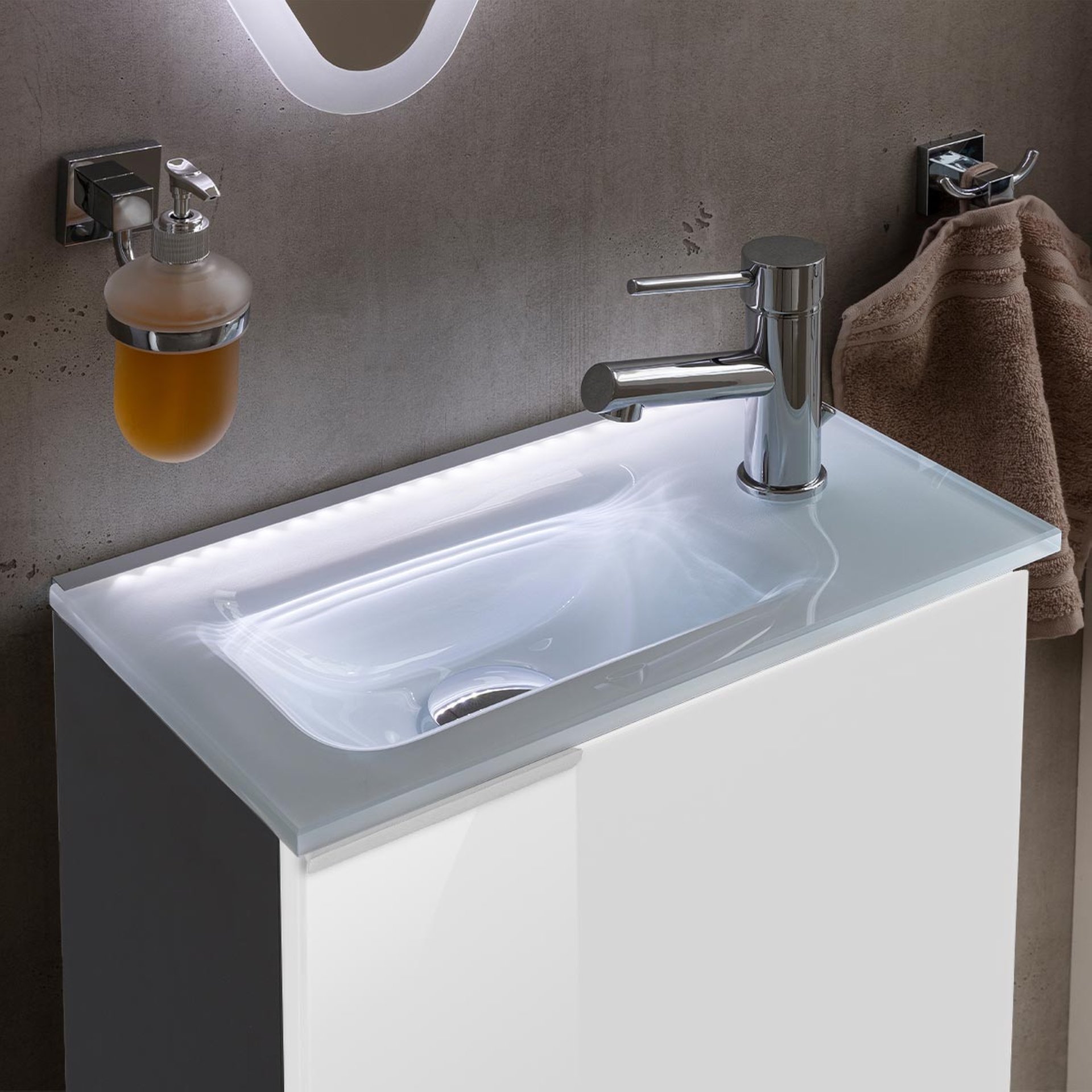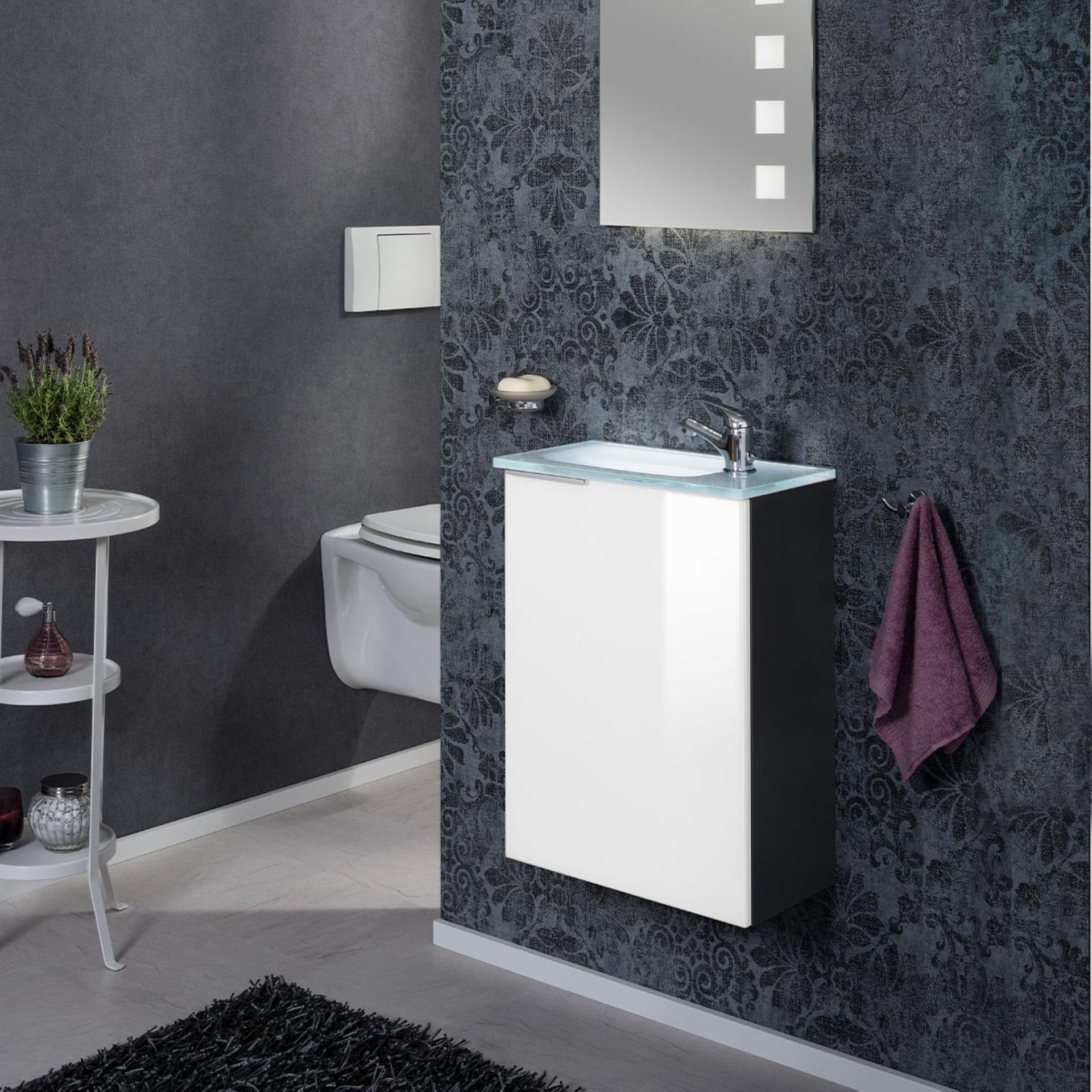 Fackelmann SBC KARA Gäste WC Waschtisch Set 45 cm breit, Weiß/Anthrazit, Waschbecken Glas Weiß, Türanschlag rechts + Waschbeckenbeleuchtung