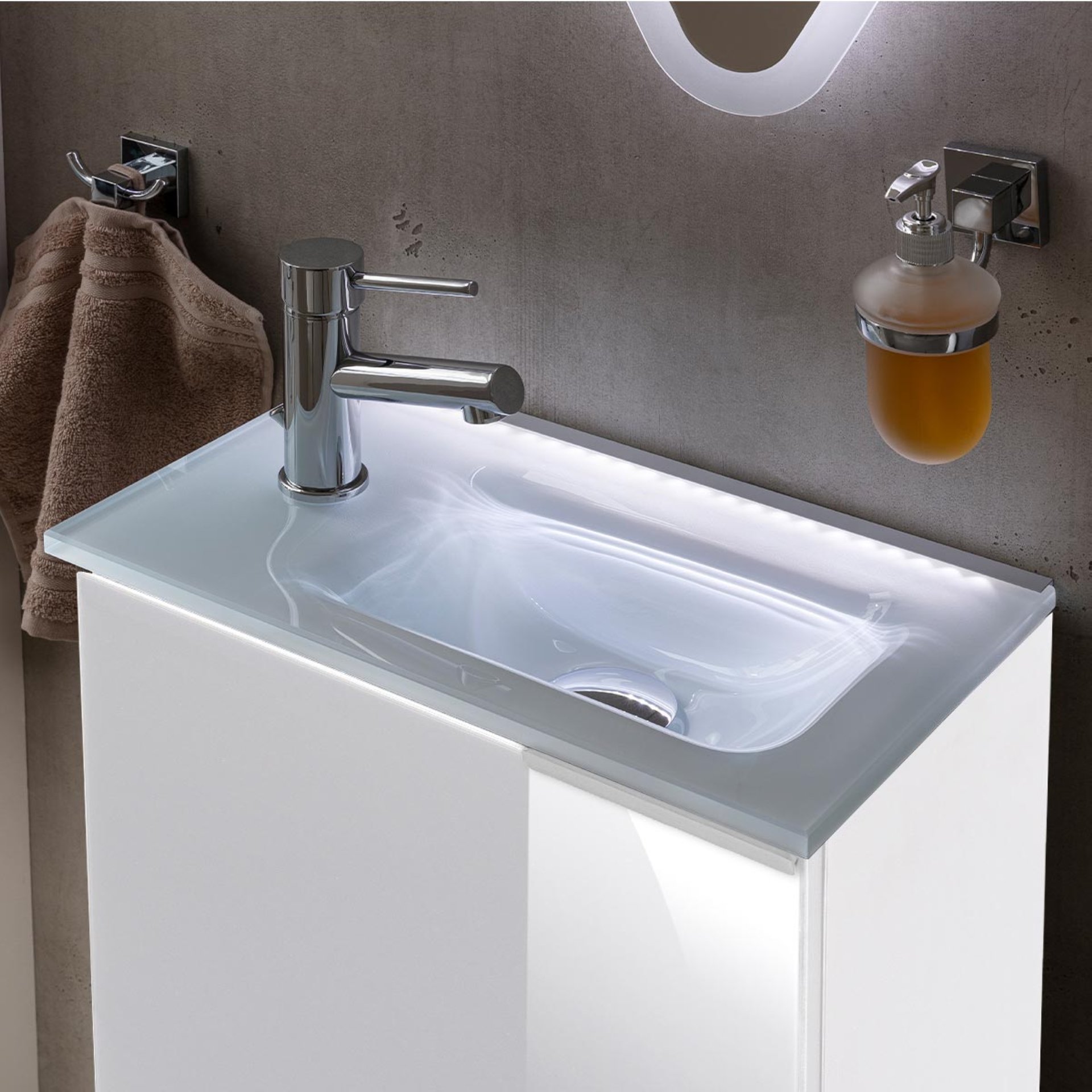 Fackelmann SBC KARA Gäste WC Waschtisch Set 45 cm breit, Weiß, Waschbecken Glas Weiß, Türanschlag links + Waschbeckenbeleuchtung