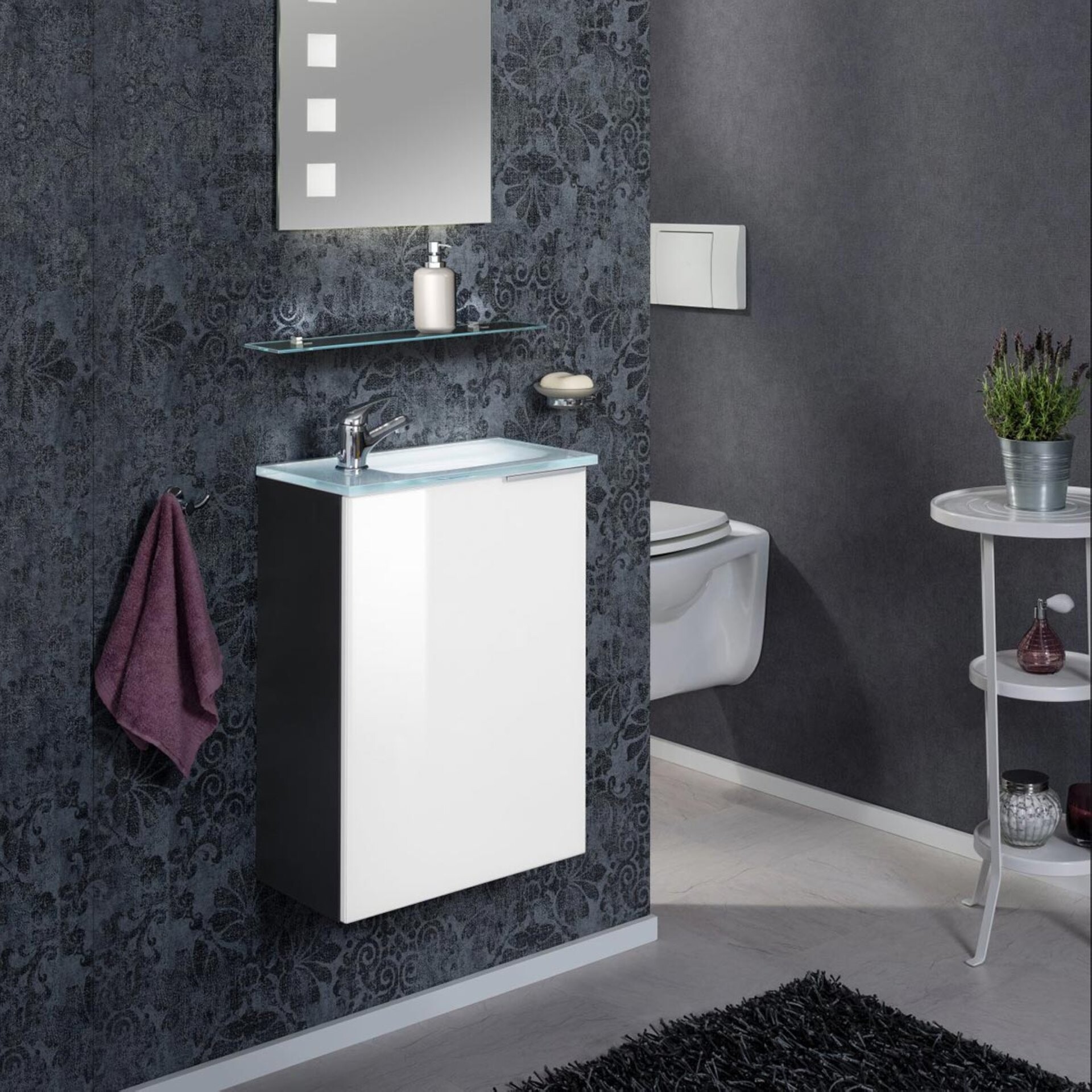 Exklusive Eleganz strahlt der Waschbeckenunterschrank SBC KARA von Fackelmann aus. Hier trifft ein Korpus in modernem Anthrazit auf eine edle Front aus weiß lackiertem Glas und erzeugt eine edle Atmosphäre. Aufgrund seiner Breite von nur 44 cm ist der Badezimmerschrank sehr schmal und damit ideal für kleine Bäder und Gäste-WCs geeignet. Platzprobleme im kleinen Badezimmer gehören ab sofort der Vergangenheit an, denn der Fackelmann SBC KARA Waschbeckenunterschrank 45 cm, Anthrazit Hochglanz/Weiß Hochglanz, links nutzt den vorhandenen Raum unter dem Waschbecken optimal aus und bietet auf einem Einlageboden Stauraum für Badutensilien und Accessoires. Der Schrank verfügt über eine links angeschlagene Tür, welche sich aufgrund der gedämpften Scharniere besonders sanft schließen lässt. Dank der vormontierten Lieferung ist der Schrank leicht in Deinem Bad integriert. Das dazu passende Waschbecken ist aus Keramik (Art.Nr. 82390) oder Glas (Art.Nr. 82397 und 82407). Das Glasbecken kann zusätzlich mit dem BackLight Mini (Art.Nr. 86301) indirekt beleuchtet werden. Waschtisch und Beleuchtung sind nicht im Lieferumfang enthalten und separat hier bei BadeDu erhältlich.