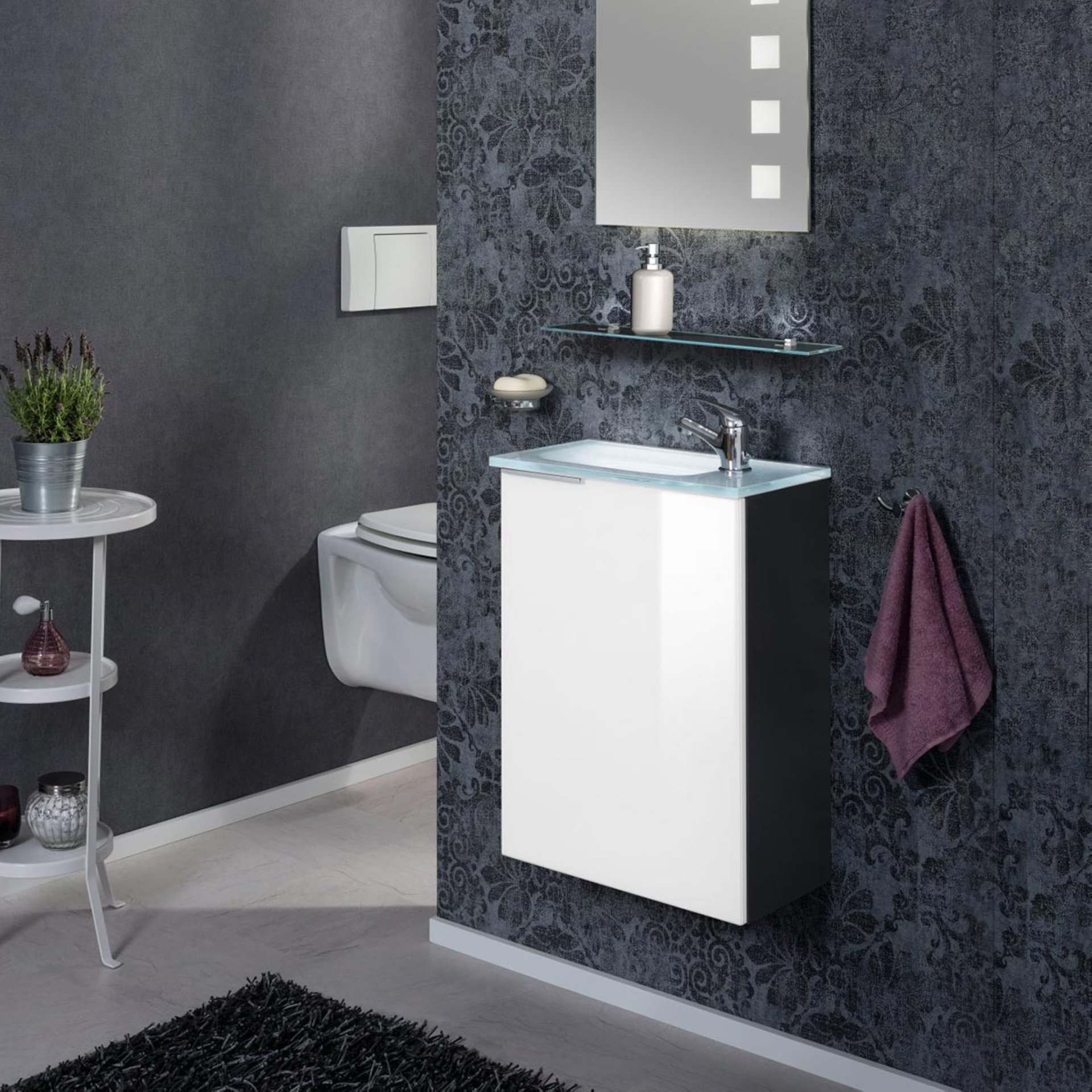 Exklusive Eleganz strahlt der Waschbeckenunterschrank SBC KARA von Fackelmann aus. Hier trifft ein Korpus in modernem Anthrazit auf eine edle Front aus weiß lackiertem Glas und erzeugt eine edle Atmosphäre. Aufgrund seiner Breite von nur 44 cm ist der Badezimmerschrank sehr schmal und damit ideal für kleine Bäder und Gäste-WCs geeignet. Platzprobleme im kleinen Badezimmer gehören ab sofort der Vergangenheit an, denn der Fackelmann SBC KARA Waschbeckenunterschrank 45 cm, Anthrazit Hochglanz/Weiß Hochglanz, rechts nutzt den vorhandenen Raum unter dem Waschbecken optimal aus und bietet auf einem Einlageboden Stauraum für Badutensilien und Accessoires. Der Schrank verfügt über eine rechts angeschlagene Tür, welche sich aufgrund der gedämpften Scharniere besonders sanft schließen lässt. Dank der vormontierten Lieferung ist der Schrank leicht in Deinem Bad integriert. Das dazu passende Waschbecken ist aus Keramik (Art.Nr. 82390) oder Glas (Art.Nr. 82397 und 82407). Das Glasbecken kann zusätzlich mit dem BackLight Mini (Art.Nr. 86301) indirekt beleuchtet werden. Waschtisch und Beleuchtung sind nicht im Lieferumfang enthalten und separat hier bei BadeDu erhältlich.