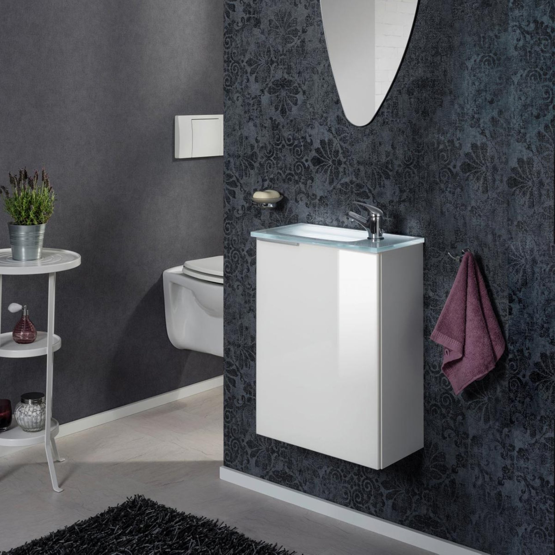 Exklusive Eleganz strahlt der Waschbeckenunterschrank SBC KARA von Fackelmann in glänzendem Weiß aus. Ein besonderer Blickfang ist dabei die Front aus lackiertem Glas, welche eine edle Atmosphäre erzeugt. Aufgrund seiner Breite von nur 44 cm ist der Badezimmerschrank sehr schmal und damit ideal für kleine Bäder und Gäste-WCs geeignet. Platzprobleme im kleinen Badezimmer gehören ab sofort der Vergangenheit an, denn der Fackelmann SBC KARA Waschbeckenunterschrank 45 cm, Weiß Hochglanz, rechts nutzt den vorhandenen Raum unter dem Waschbecken optimal aus und bietet auf einem Einlageboden Stauraum für Badutensilien und Accessoires. Der Schrank verfügt über eine rechts angeschlagene Tür, welche sich aufgrund der gedämpften Scharniere besonders sanft schließen lässt. Dank der vormontierten Lieferung ist der Schrank leicht in Deinem Bad integriert. Das dazu passende Waschbecken ist aus Keramik (Art.Nr. 82390) oder Glas (Art.Nr. 82395 und 82407). Das Glasbecken kann zusätzlich mit dem BackLight Mini (Art.Nr. 86301) indirekt beleuchtet werden. Waschtisch und Beleuchtung sind nicht im Lieferumfang enthalten und separat hier bei BadeDu erhältlich.