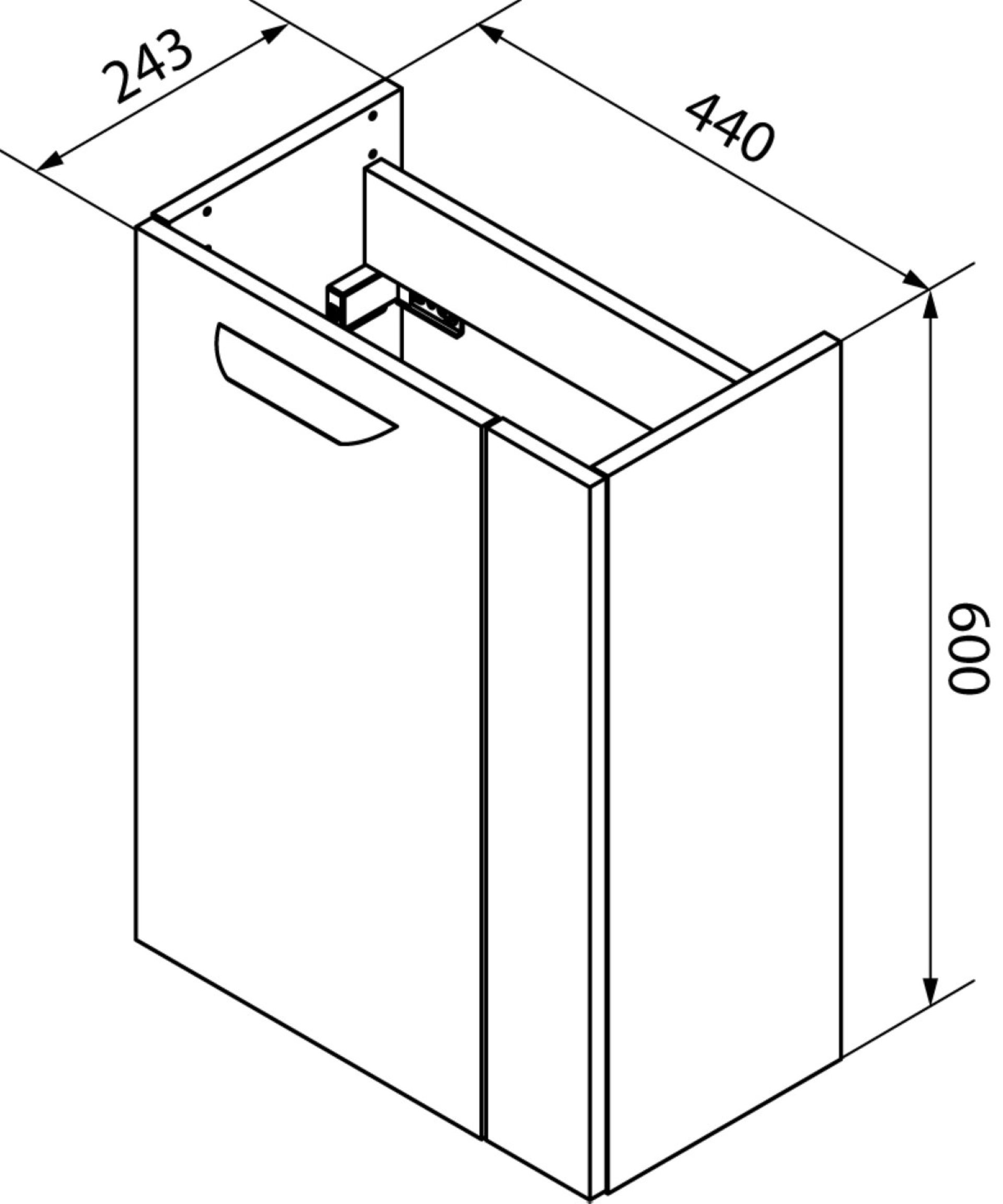 - Ausstattung: 1 Tür (links), 1 Einlegeboden, gedämpfte Scharniere, Griff Chrom glänzend