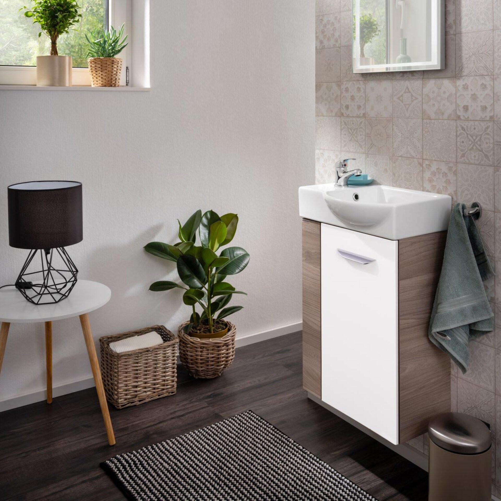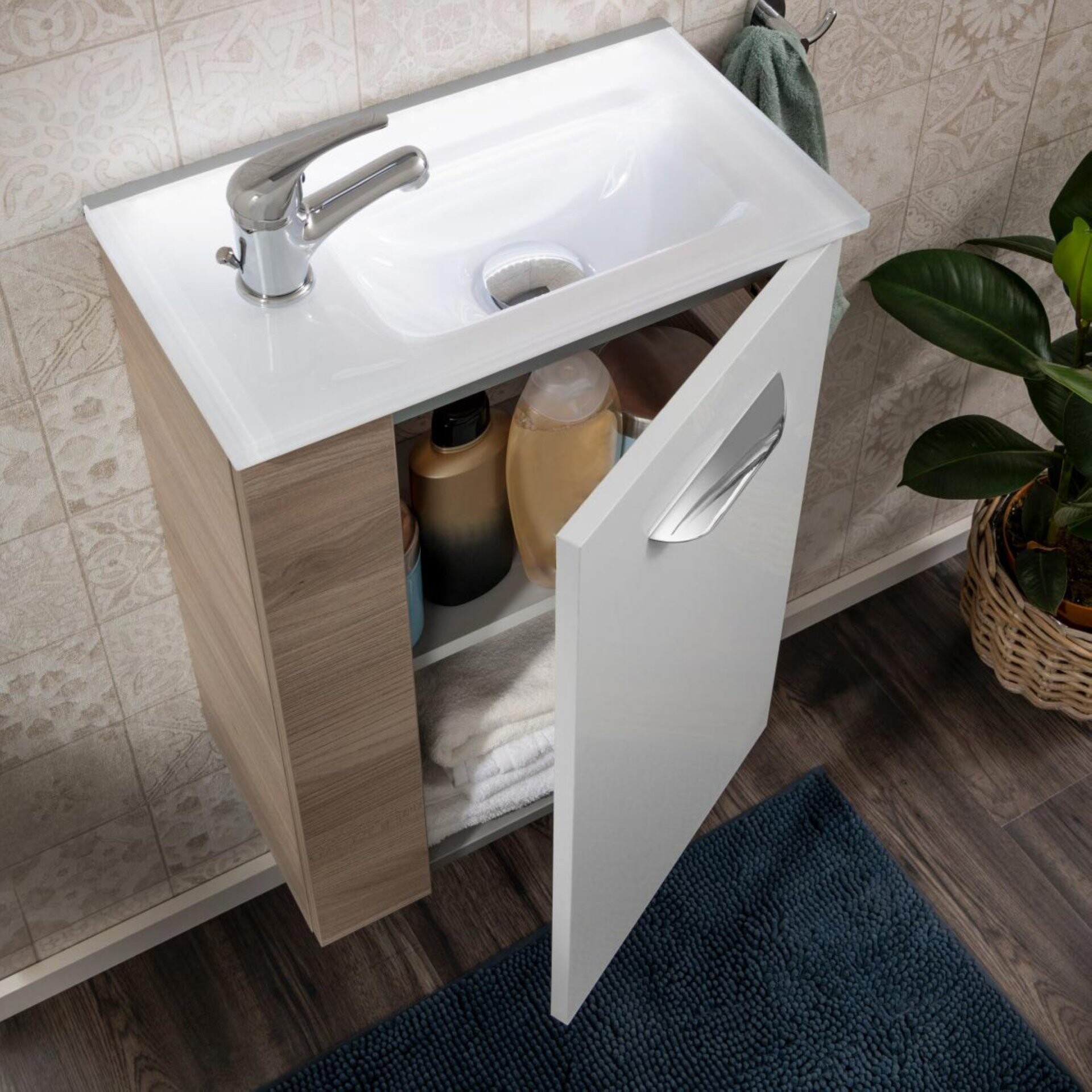 Der Waschbeckenunterschrank SBC LUXOR von Fackelmann bringt durch sein grau-braunes Dekor mit Holzoptik Natürlichkeit in die Badeinrichtung. Der 44 cm breite Badschrank verfügt über eine weiße Tür mit Türanschlag links, die dank Soft-Close sanft schließt. Auf Grund seiner Größe eignet sich dieser Fackelmann SBC LUXOR Waschbeckenunterschrank 45 cm, Braun hell/Weiß, rechts hervorragend für das Gäste-WC und kleine Badezimmer. Badmöbel von Fackelmann werden mit viel Liebe zum Detail in Deutschland gefertigt. Der Schrank wird vormontiert geliefert und ist dadurch leicht in Deinem Bad integriert. Das dazu passende Waschbecken ist aus Keramik (Art.Nr. 82391) oder Glas (Art.Nr. 82397 und 82407). Das Glasbecken kann zusätzlich mit dem BackLight Mini (Art.Nr. 86301) indirekt beleuchtet werden. Waschtisch und Beleuchtung sind nicht im Lieferumfang enthalten und separat hier bei BadeDu erhältlich.