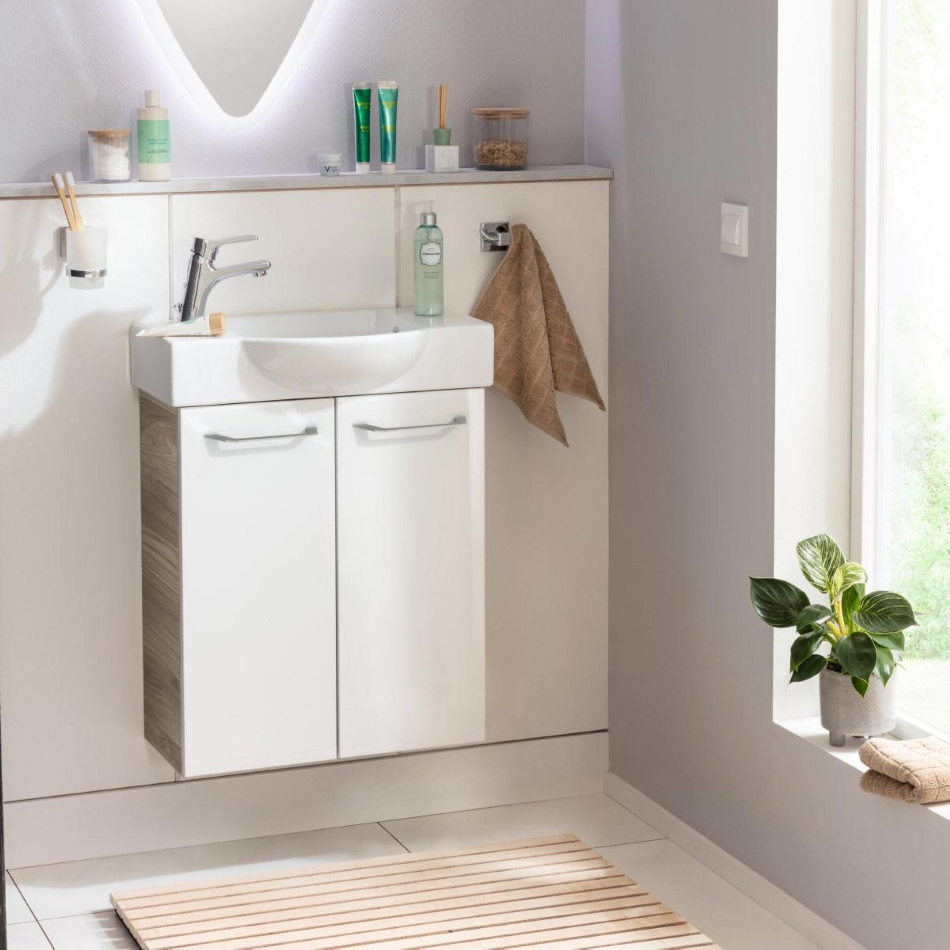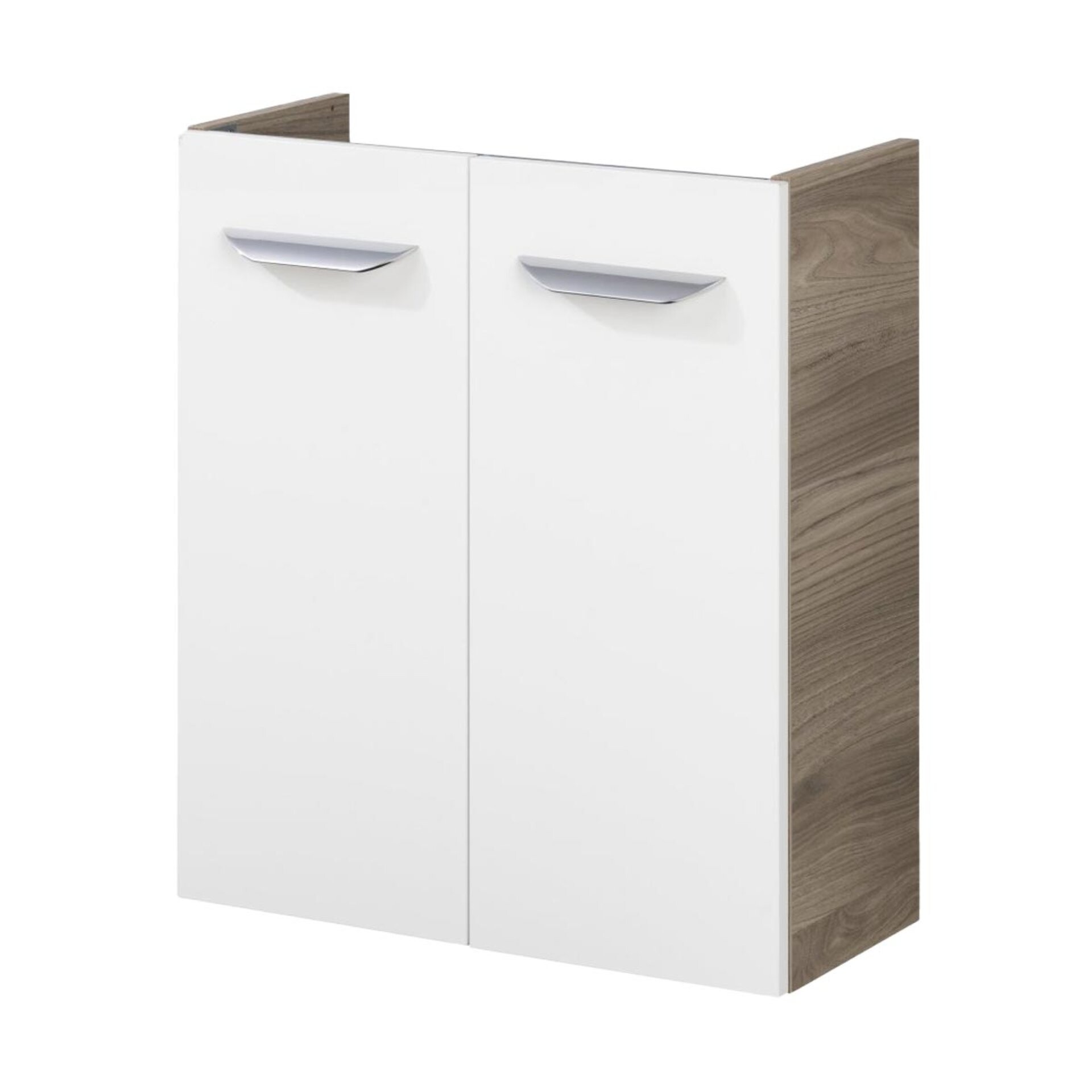 Der Waschbeckenunterschrank SBC LUXOR von Fackelmann bringt durch sein grau-braunes Dekor mit Holzoptik Natürlichkeit in die Badeinrichtung. Der 52 cm breite Badschrank verfügt über zwei weiße Türen, die dank Soft-Close sanft schließen. Auf Grund seiner Größe eignet sich dieser Waschtischunterschrank hervorragend für das Gäste-WC und kleine Badezimmer. Badmöbel von Fackelmann werden mit viel Liebe zum Detail in Deutschland hergestellt. Der Fackelmann SBC LUXOR Waschbeckenunterschrank 55 cm, Braun hell/Weiß, 2 Türen wird vormontiert geliefert und ist dadurch leicht in Deinem Bad integriert. Das dazu passende Waschbecken ist aus Keramik (Art.Nr. 82392 oder 82382). Der Waschtisch ist nicht im Lieferumfang enthalten und separat hier bei BadeDu erhältlich.