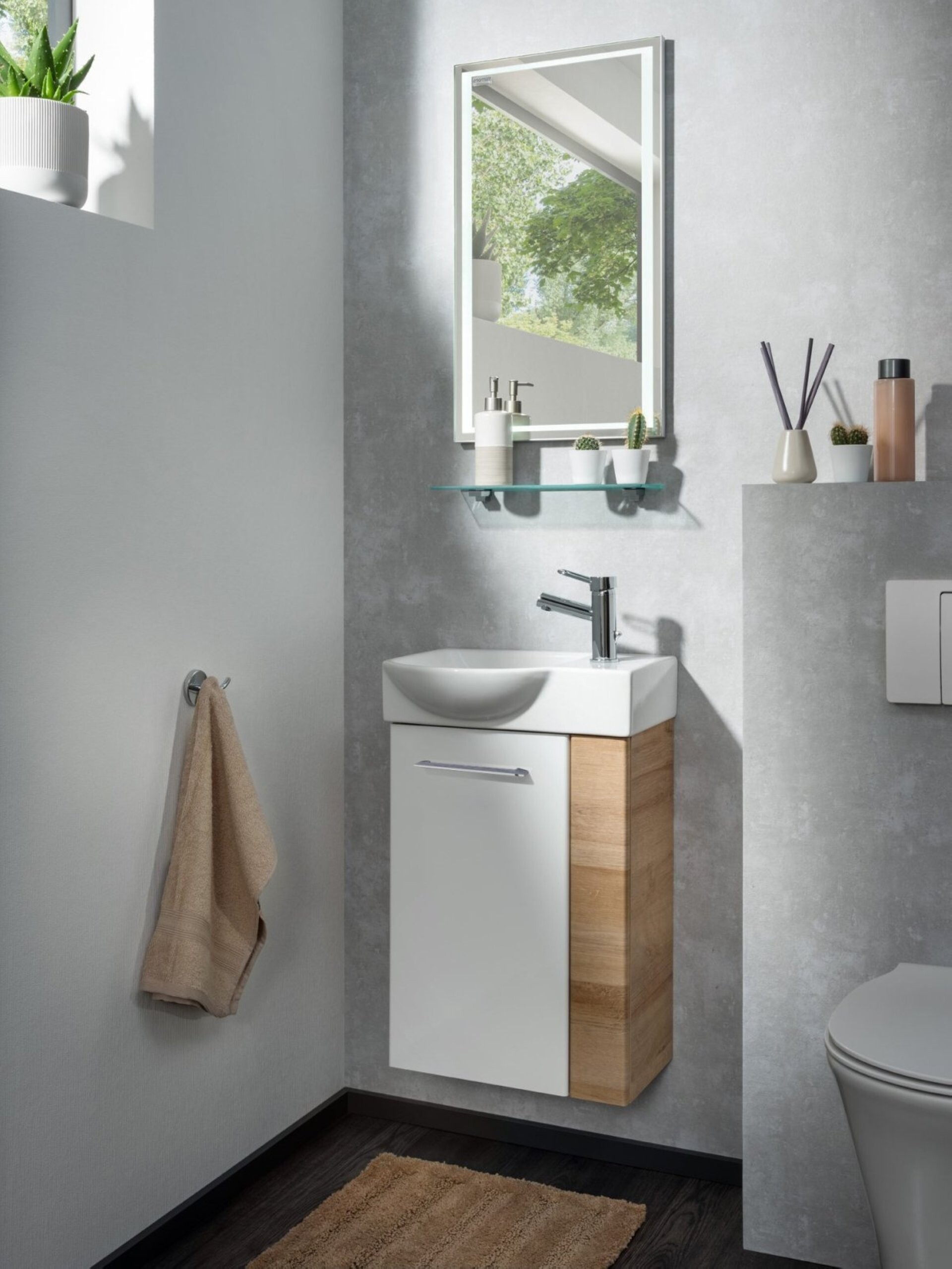 Fackelmann SBC MILANO Gäste WC Set 4-teilig 45 cm, Braun hell/Weiß, links, Keramik Hahnloch rechts, LED-Spiegel + Glasablage