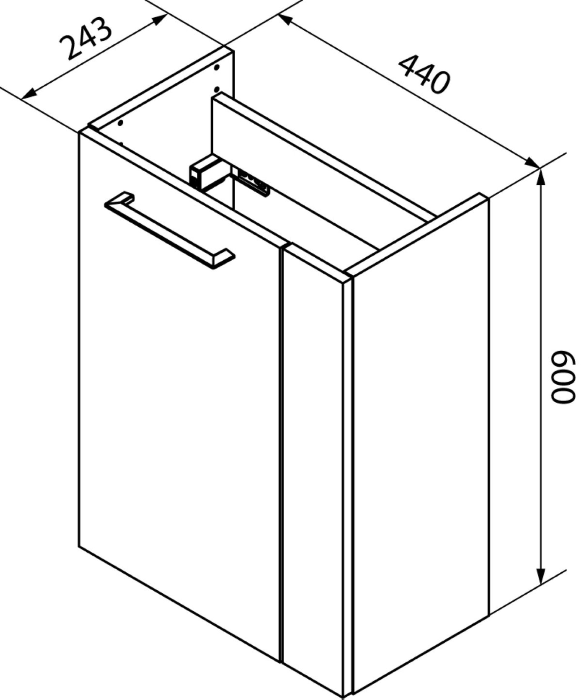 - Ausstattung: 1 Tür (rechts), 1 Einlegeboden, gedämpfte Scharniere, Griff Chrom glänzend