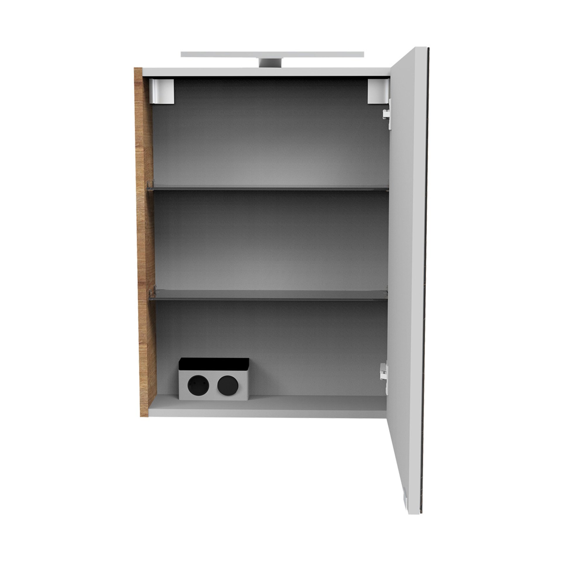 Du magst eine natürliche Optik in Deinem Badezimmer. Dann hast Du mit dem 50 cm breiten Spiegelschrank aus der Serie MILANO von Fackelmann genau das Passende gefunden. Die Struktur und Maserung der Oberflächen im Design Ast-Eiche sind von natürlichen Wuchsrissen des Baumes durchzogen. So ergibt sich ein markantes Bild. Mit dem kleinen unauffälligen Griff lässt sich der Schrank einfach und leicht öffnen. Bei geöffneter Tür mit rechtem Türanschlag offenbart sich im Inneren eine praktische Unterteilung mit zwei Glaseinlegeböden. Ausreichend Platz für all die Accessoires, die man in kleinen Bädern oder Gäste WC's benötigt. Zusätzlich befindet sich im unteren Fach des modernen Spiegelschrank eine Elektrobox mit Schalter und Steckdose. Praktisch für alle Elektrogeräte, wie Fön, elektrische Zahnbürste oder Lockenstab. Die verchromte LED-Leuchte beleuchtet Dein Spiegelbild optimal für das tägliche Pflegeritual. Mit viel Liebe zum Detail werden Badmöbel von Fackelmann in Deutschland hergestellt. Der Fackelmann SBC MILANO Gäste-WC Spiegelschrank 50 cm, Braun hell, rechts ist vormontiert und damit schnell in Deinem Bad integriert.