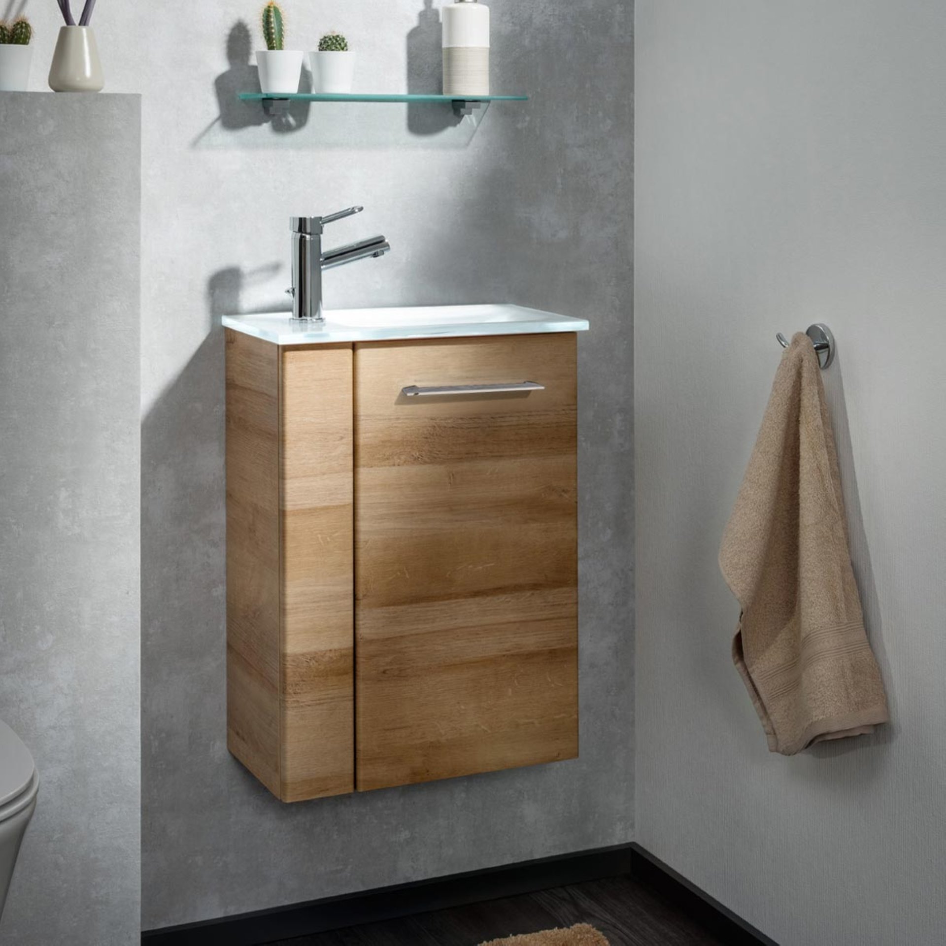 Fackelmann SBC MILANO Gäste WC Waschtisch Set 45 cm breit, Braun hell, Waschbecken Glas Weiß, Türanschlag rechts