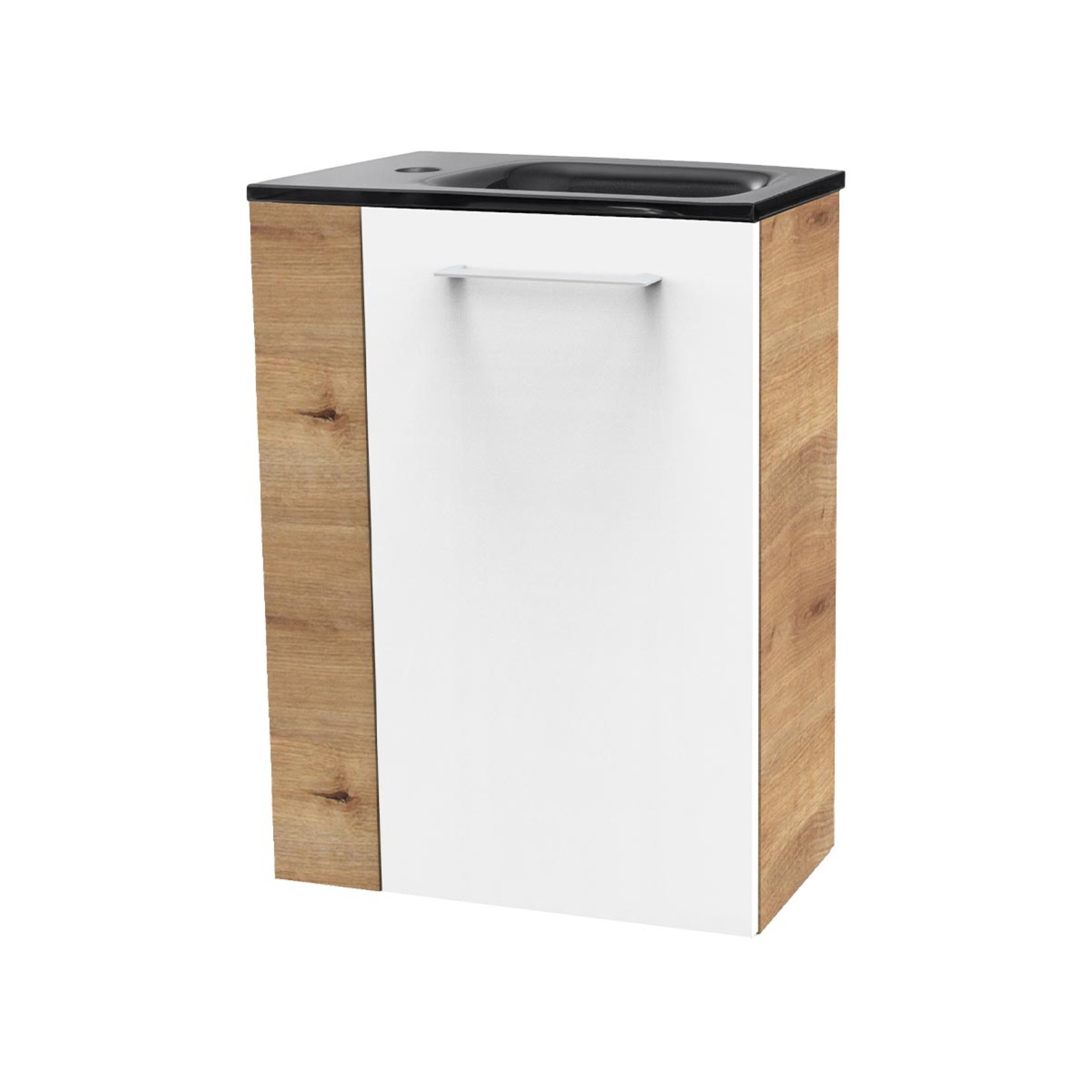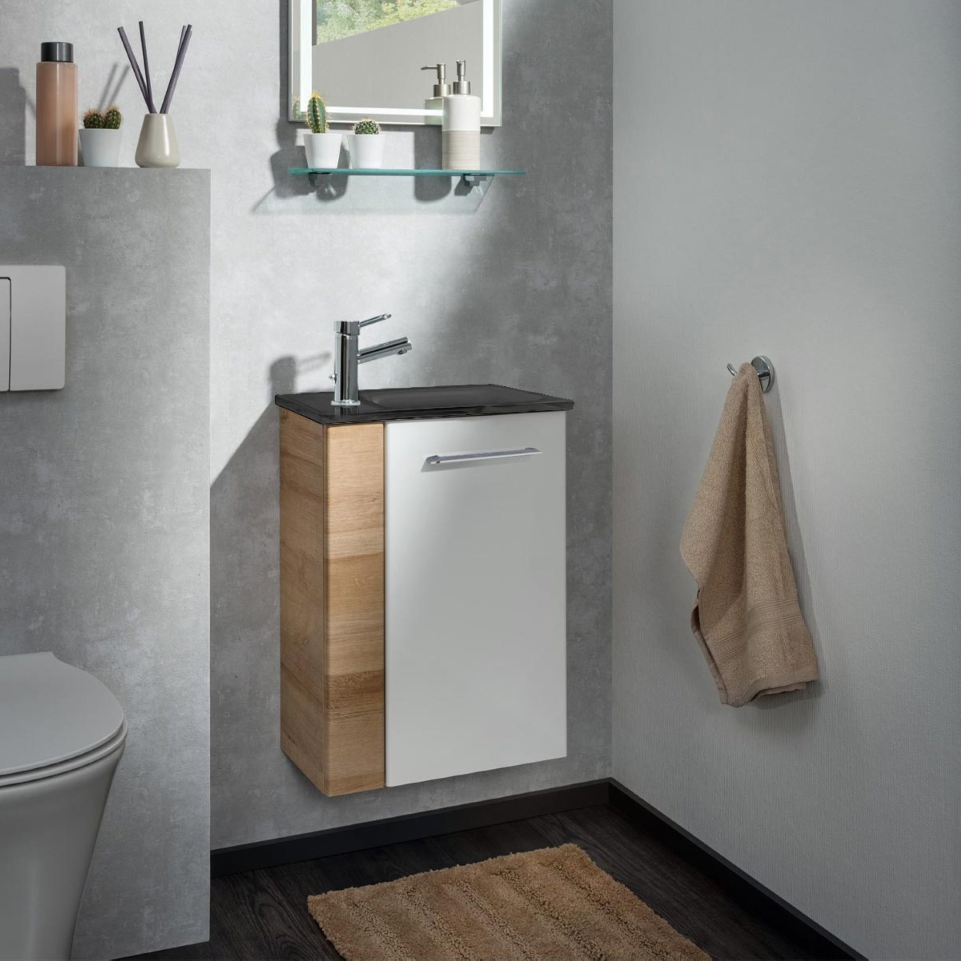 Fackelmann SBC MILANO Gäste WC Waschtisch Set 45 cm breit, Weiß/Braun hell, Waschbecken Glas Anthrazit, Türanschlag rechts