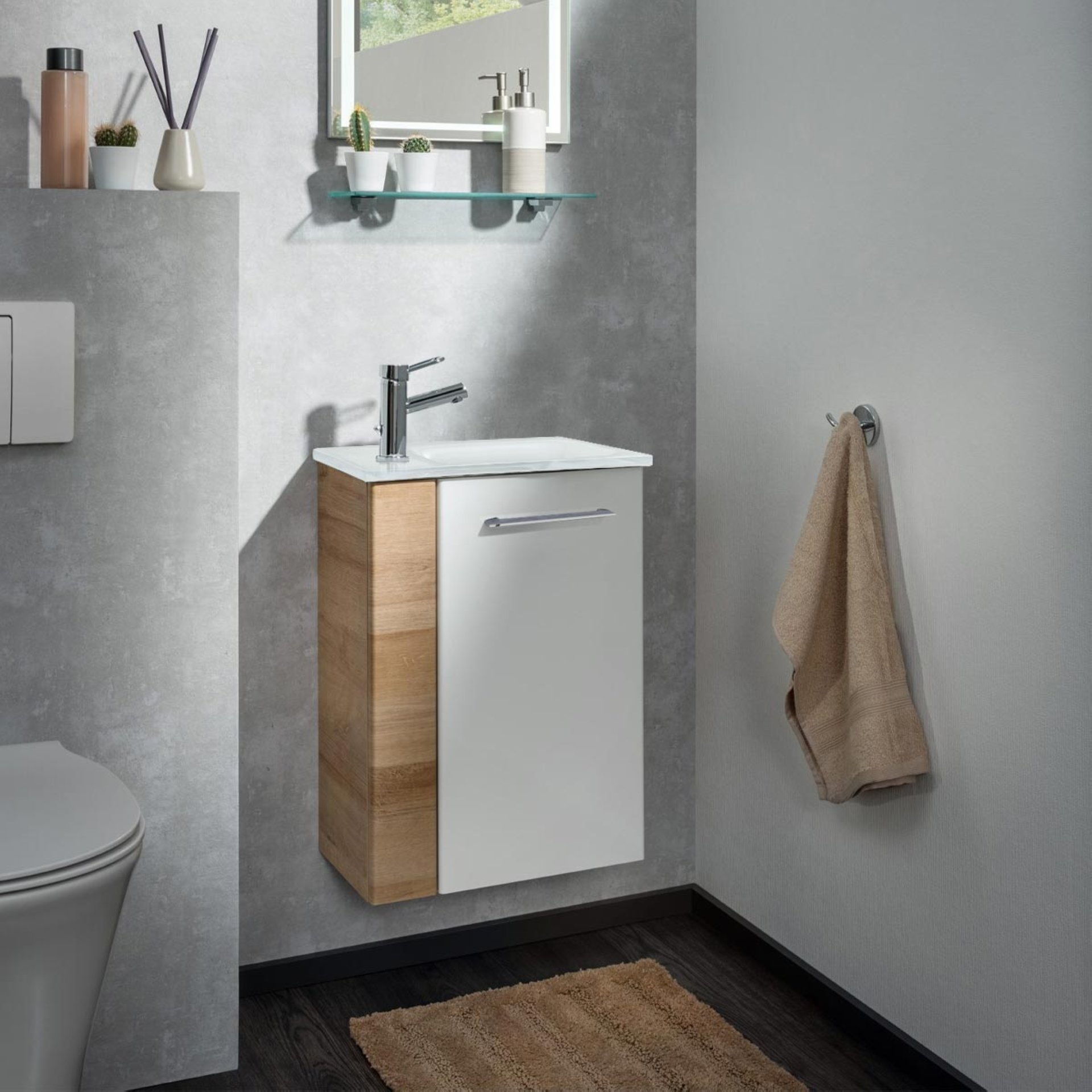 Fackelmann SBC MILANO Gäste WC Waschtisch Set 45 cm breit, Weiß/Braun hell, Waschbecken Glas Weiß, Türanschlag rechts