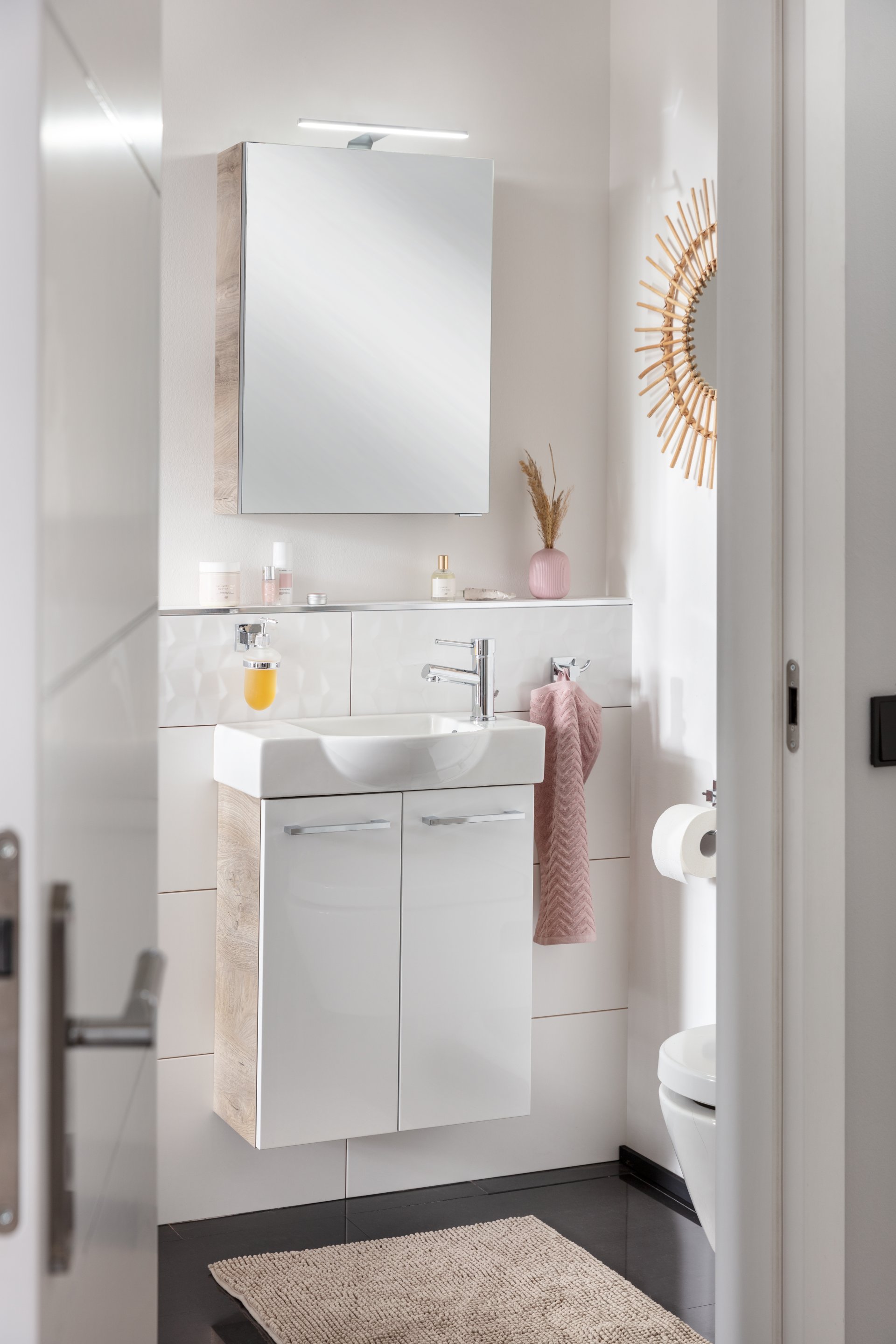 Lust auf Natur pur? Für gemütliche Natürlichkeit im kleinen Badezimmer oder Gäste-WC sorgt das 2-teilige Gäste-WC-Set STANFORD von Fackelmann. Das 55 cm breite Set besteht aus einem Waschbeckenunterschrank in hellbrauner Holzoptik mit weißer Front sowie einem weißen Waschbecken aus Keramik. Verabschiede Dich von Platzproblemen und Unordnung, denn hinter den beiden Türen bietet der Unterschrank viel Stauraum für die wichtigsten Badutensilien im Gästebad. Der Korpus des Schranks ist vollständig in einem Design gehalten, welches an die rustikale Optik der Eiche angelehnt ist. Einen angenehmen Kontrast dazu bildet die weiß-glänzende Front. Perfekte Harmonie erzeugt das weiße Keramikbecken, wobei die geschwungene Waschmulde ein echter Blickfang ist. Auf der rechten Seite bietet ein vorgebohrtes Hahnloch Platz für die Armatur. Mit viel Liebe zum Detail werden die Badmöbel von Fackelmann in Deutschland hergestellt. Das Fackelmann SBC STANFORD Gäste WC Set 2-teilig 55 cm, Braun hell/Weiß, 2 Türen, Keramik Hahnloch rechts ist vormontiert und kann damit schnell und einfach in Dein Badezimmer einziehen.