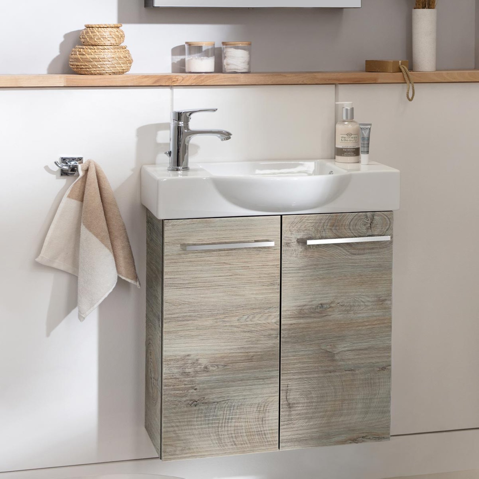 Lust auf Natur pur? Dann ist der Waschbeckenunterschrank SBC STANFORD von Fackelmann genau richtig für Dich! Mit seiner hellbraunen Holzoptik, welche an das warme Holz der Eiche erinnert, erschafft er eine angenehme Atmosphäre. Aufgrund seiner Breite von nur 52 cm ist der Badezimmerschrank sehr schmal und damit ideal für kleine Bäder und Gäste-WCs geeignet. Platzprobleme im kleinen Badezimmer gehören ab sofort der Vergangenheit an, denn der Fackelmann SBC STANFORD Waschbeckenunterschrank 55 cm, Braun hell, 2 Türen nutzt den vorhandenen Raum unter dem Waschbecken optimal aus und bietet auf einem Einlageboden Stauraum für Badutensilien und Accessoires. Der Schrank verfügt über zwei Türen, welche sich aufgrund der gedämpften Scharniere besonders sanft schließen lässt. Dank der vormontierten Lieferung ist der Schrank leicht in Deinem Bad integriert. Das dazu passende Waschbecken ist aus Keramik (Art.Nr. 82392 oder 82382). Der Waschtisch ist nicht im Lieferumfang
