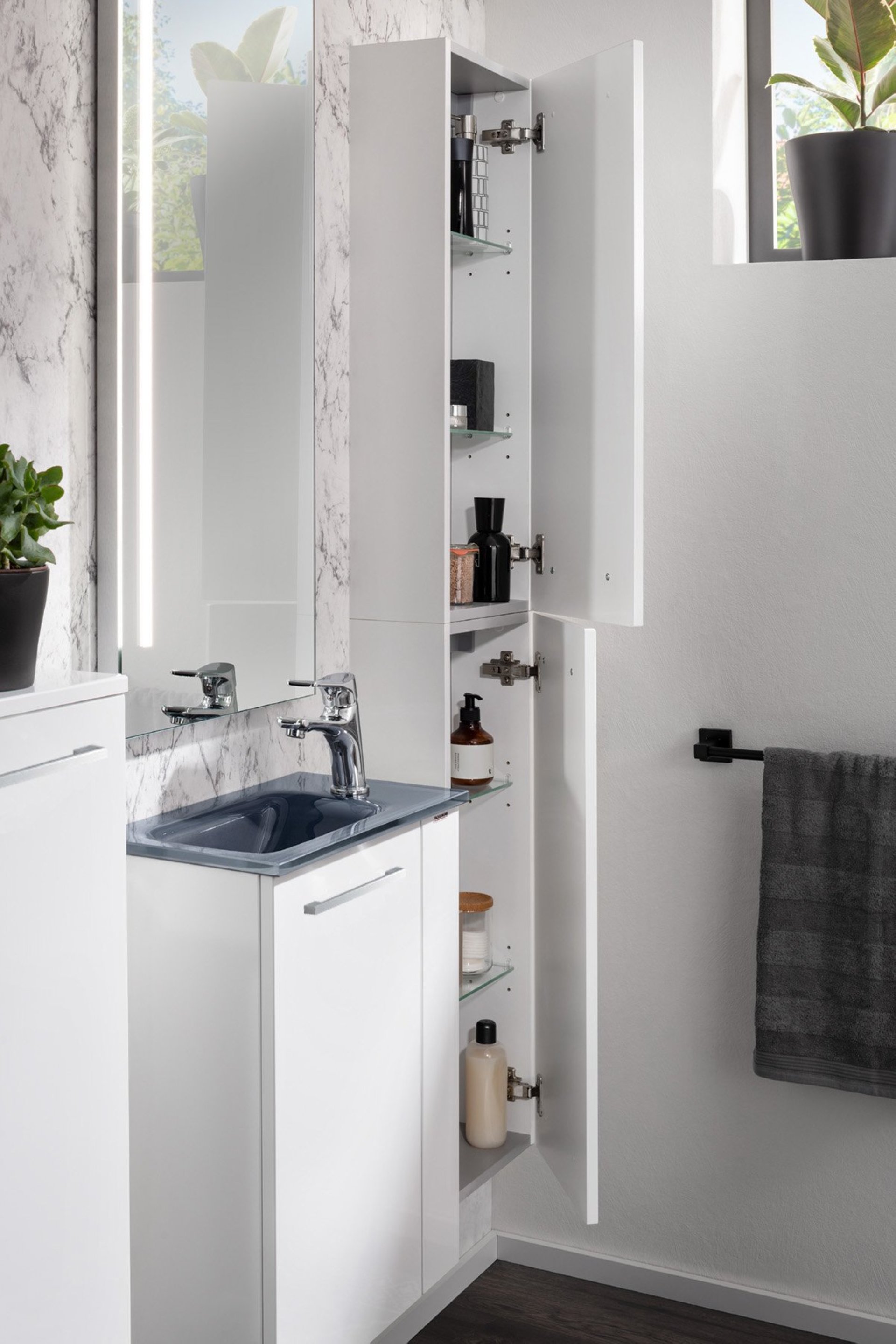 Stauraumwunder für Gäste WC's! Der schmale und tiefenreduzierte Hochschrank von Fackelmann mit glänzend weißer Front eignet sich perfekt für kleine Räume in denen zusätzlicher Platzbedarf gewünscht ist. Gäste WC's oder kleine Bäder sind so immer aufgeräumt. Vier Glaseinlegeböden unterteilen den Schrank und eignen sich perfekt für Deine Badaccessoires. Gedämpfte Scharniere garantieren ein sanftes Schließen. Ein exklusiver Blickfang in Deinem modernen Badezimmer. Mit viel Liebe zum Detail wird das Fackelmann SCENO Hochschrank slim 30 cm Breit, Korpus Weiß Matt, Front Weiß Hochglanz in Deutschland hergestellt. Der zerlegte Badschrank wird mit einer leicht verständlichen Aufbauanleitung schnell und zuverlässig geliefert.