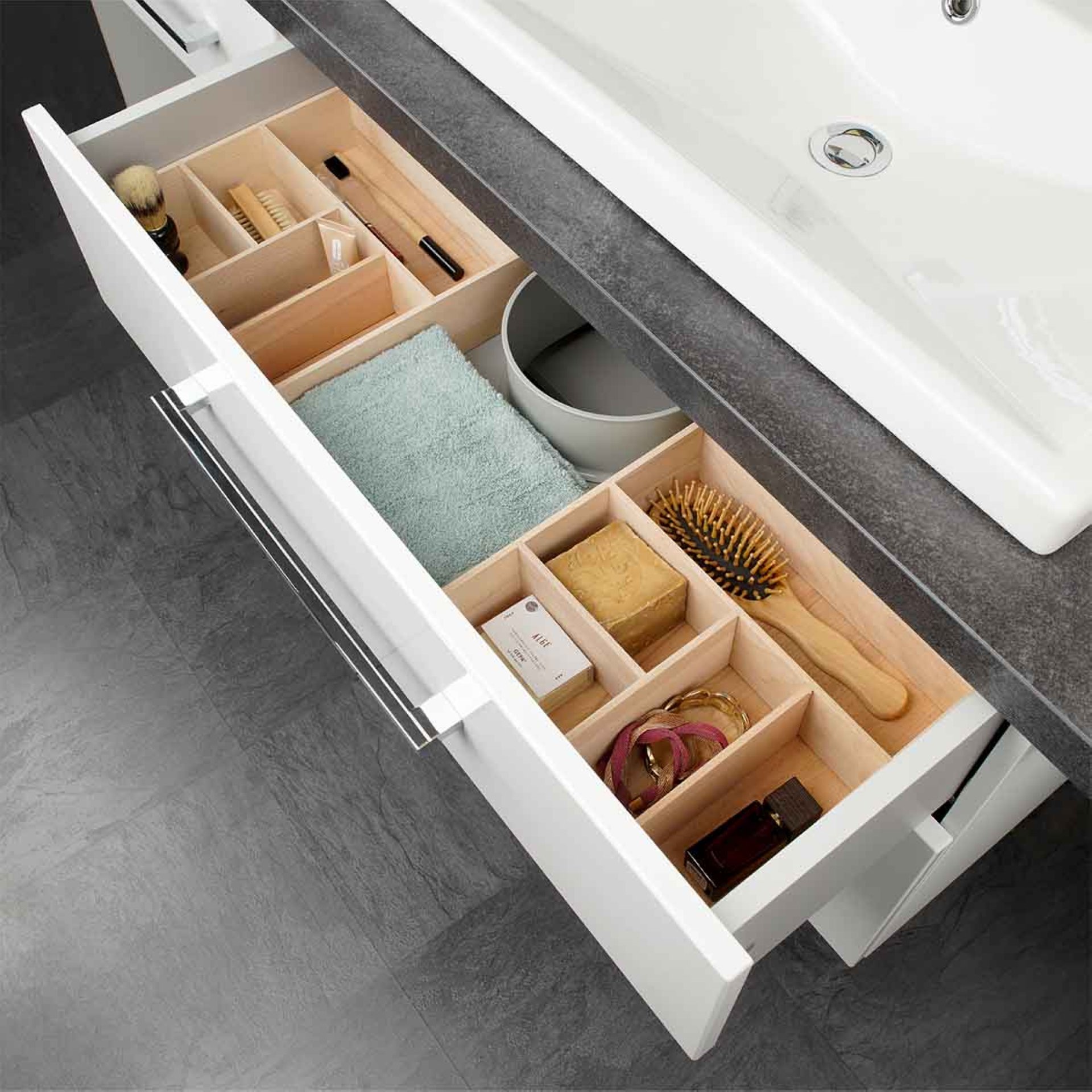 Der Schubkasten Einsatz aus Buchenholz von Fackelmann im Setzkastendesign mit sechs extra hohen Fächern sorgt für eine aufgeräumte Schublade. Das Buchenholz ist geölt und sauber an den Kanten verleimt. Hier fühlen sind auch kleine Badutensilien gut aufgeräumt und sind immer griffbereit. Der Fackelmann Schubkasten Einsatz Breite 26 cm Buchenholz ist auf die Schubladen von Fackelmann Waschtischunterschränken optimal angepasst. Selbstverständlich kannst Du sie auch in alle anderen passenden Schubkästen von Fackelmann Badschränken verwenden.
