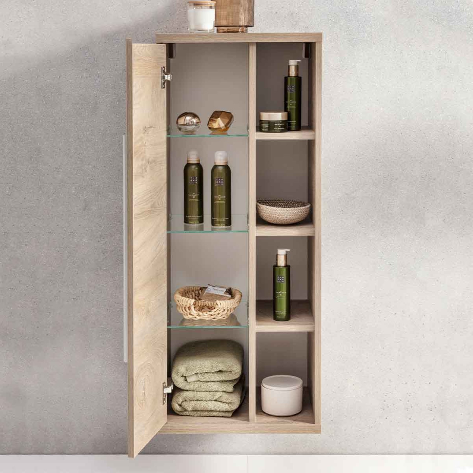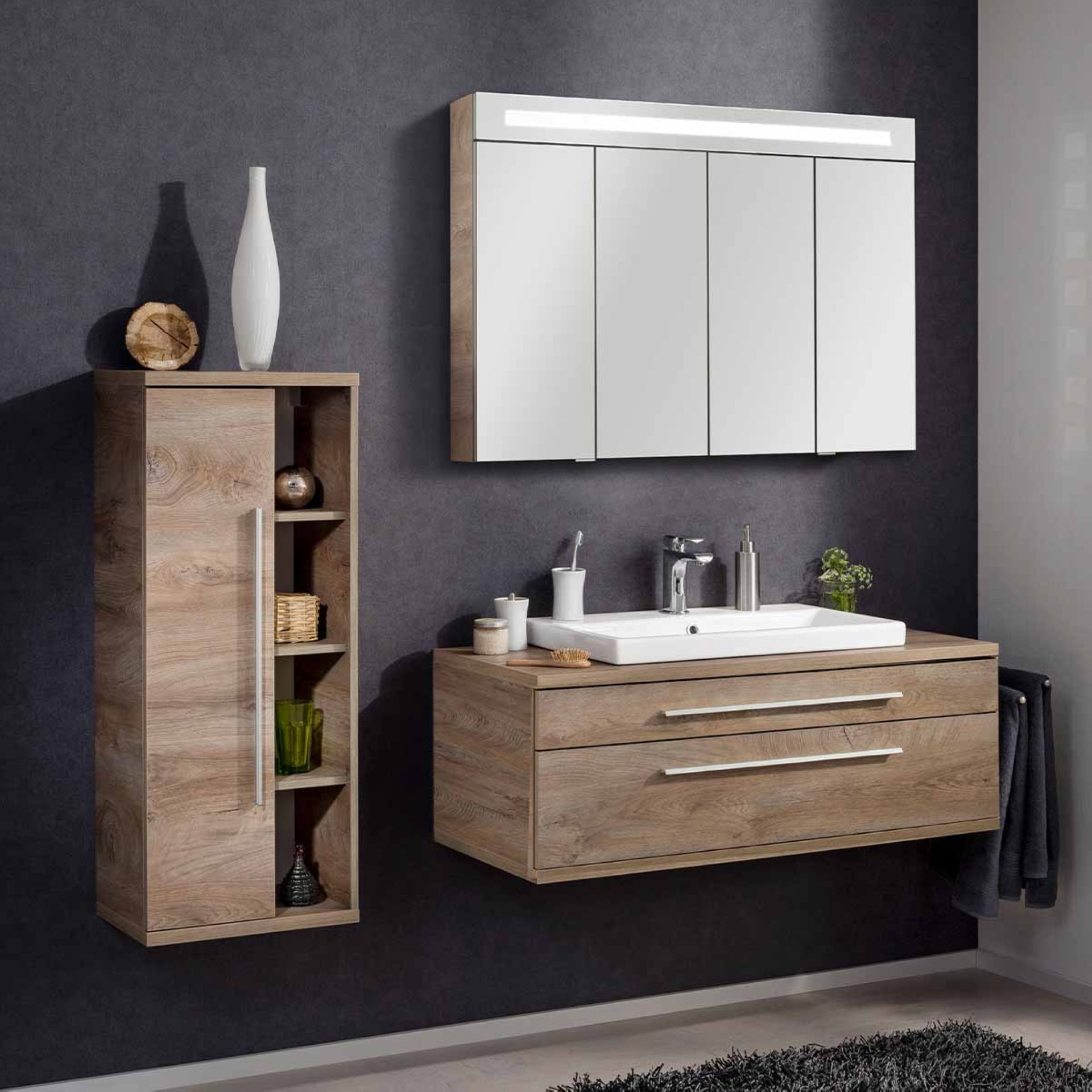Ein extravagantes Highlight für jedes Badezimmer ist der Fackelmann Midischrank aus der Serie STANFORD mit einer eichefarbenen Tür und dem Regal mit seinen vier Fächern. Durch das Regal ergibt sich die Möglichkeit einer ganz persönlichen Dekoration. So wird jeder Badschrank zu einem unverwechselbaren Unikat. Korpus und Front sind im trendigen Braunton gehalten. Dieser ist der Optik von Eichenholz nachempfunden. Die Griffleiste in mattem Aluminium verleiht ihm ein exklusives Aussehen. Der Badschrank ist mit einer Tür mit linkem Türanschlag ausgestattet, die gedämpfte Scharniere hat. Somit gelingt das Schließen fast geräuschlos. Mit seinen drei Glaseinlegeböden und einer Höhe von 106 cm bietet der moderne Schrank genügend Stauraum für ein aufgeräumtes Bad. Der Fackelmann STANFORD Midischrank 42 cm, Braun, links wird vormontiert geliefert. Somit ist er sofort in Deinem Bad integriert und der lästige Zusammenbau entfällt. Fackelmann Badmöbel werden mit viel Liebe zum Detail in Deutschland hergestellt.