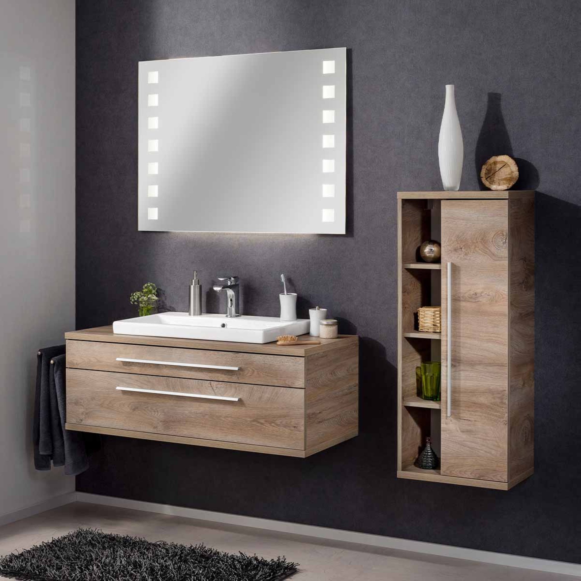Design: Korpus Nature Oak und Front Nature Oak (Eiche Natur), Abdeckplatte und Boden Design Nature Oak/Braun hell, mit Beckenausschnitt, inklusive Raumsparsiphon,