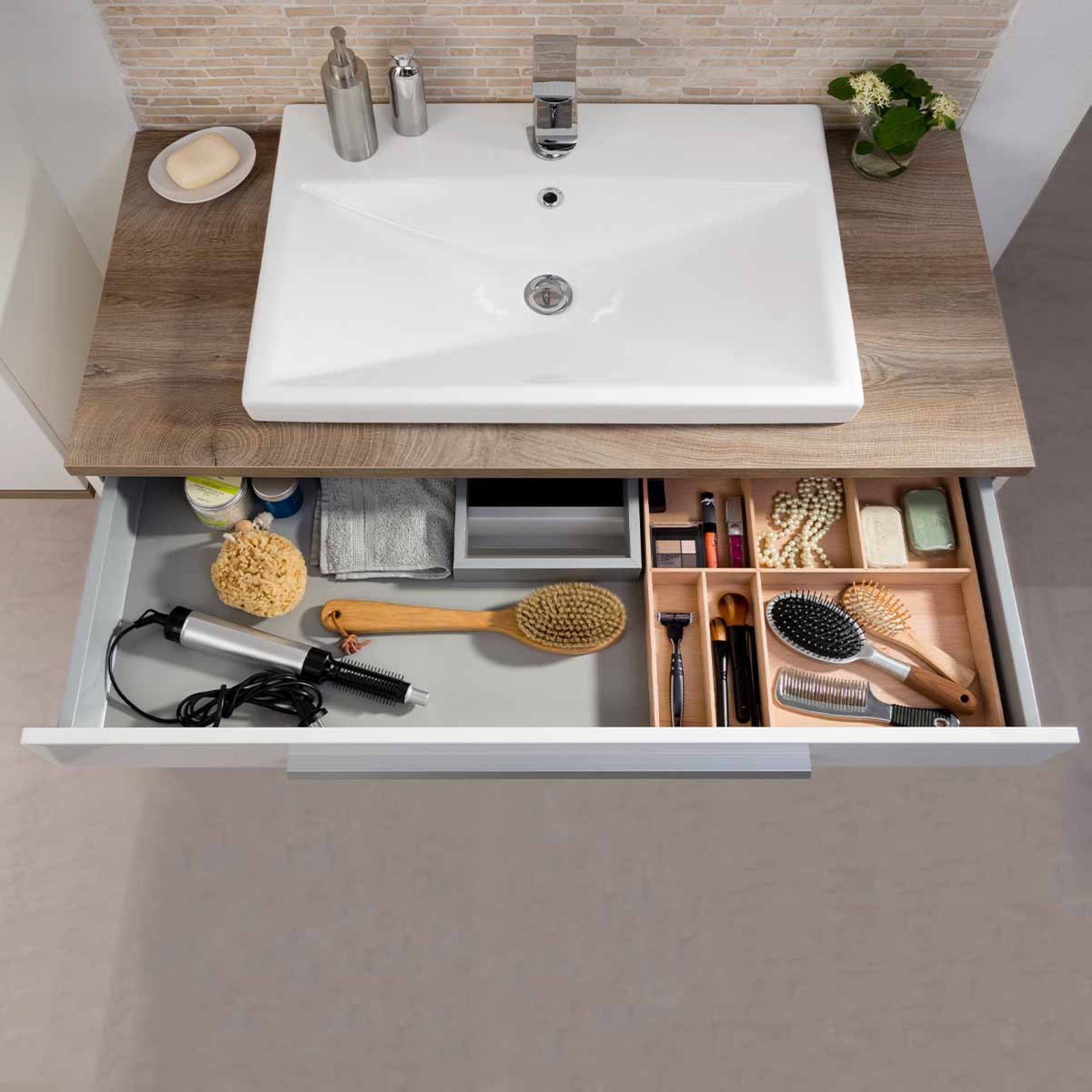Design: Korpus Weiß Glanz und Front Weiß Hochglanz, Abdeckplatte und Boden Design Nature Oak/Braun hell, mit Beckenausschnitt, inklusive Raumsparsiphon