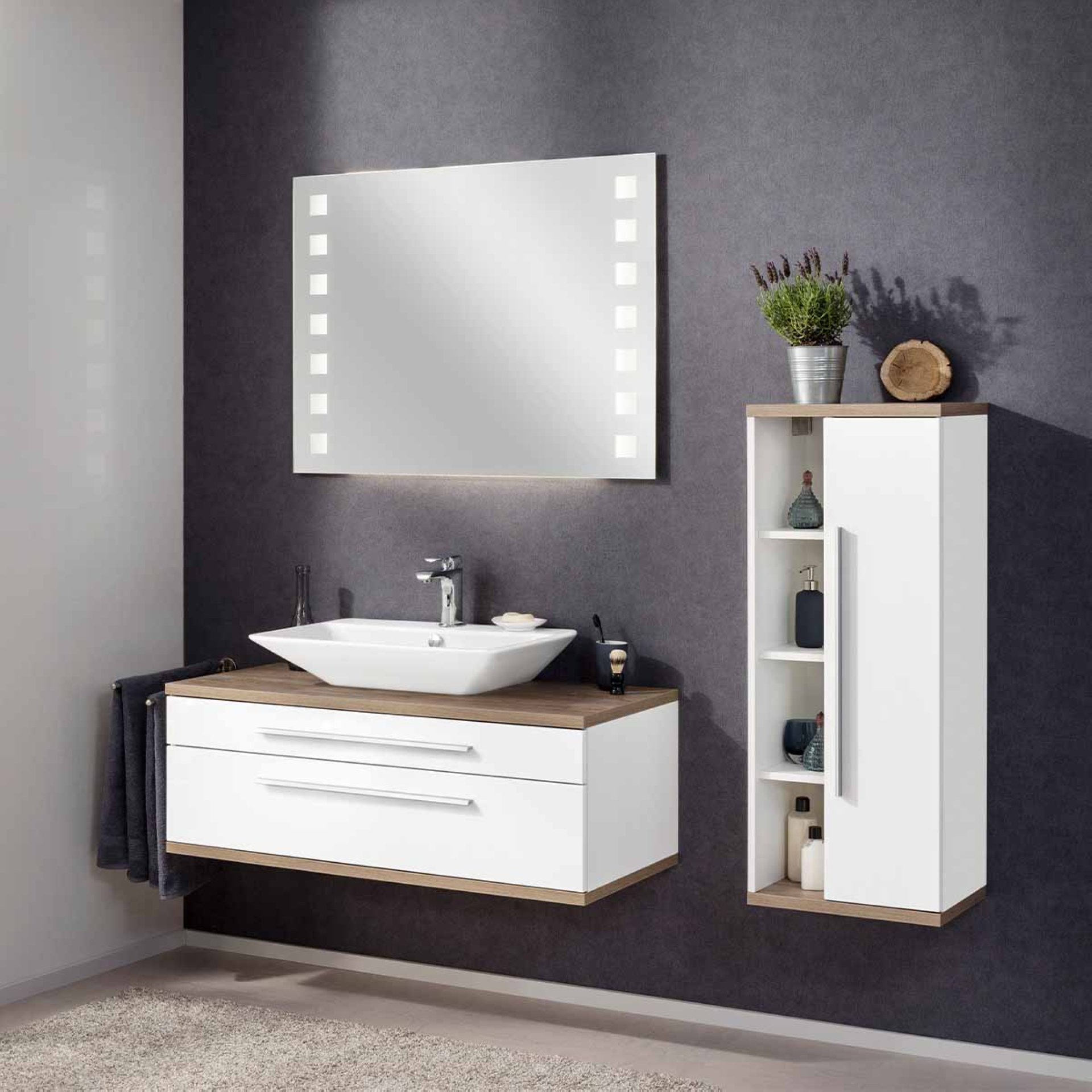 - Farbe/Design: Korpus und Front Weiß, Abdeckplatte und Boden Nature Oak