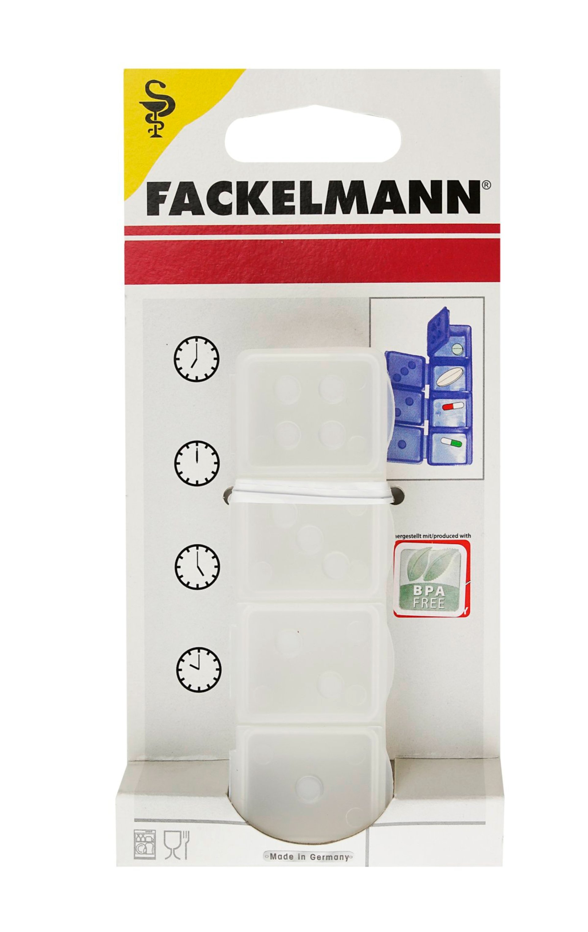 Bei der Einnahme von verschiedenen Medikamenten und Vitaminen kann man schnell den Überblick verlieren. Mit der Fackelmann Tablettenbox 4 Fächer wird Dir geholfen, immer zur richtigen Zeit das richtige Medikament einzunehmen. Dies wird durch 4 verschieden nummerierte Fächer, die den Tages- oder Wochenverlauf repräsentieren, ermöglicht. Egal ob Morgens, Mittags, Abends oder Nachts, die Pillendose hilft Dir immer Dich daran zu erinnern, Deine Medikamente zu Dir zu nehmen. Zusätzlich musst Du nie wieder nach irgendwelchen Tabletten suchen, da sie immer griffbereit und sortiert zugänglich sind. Der Hersteller Fackelmann steht seit vielen Jahrzehnten für Qualität, Zuverlässigkeit und Innovation.