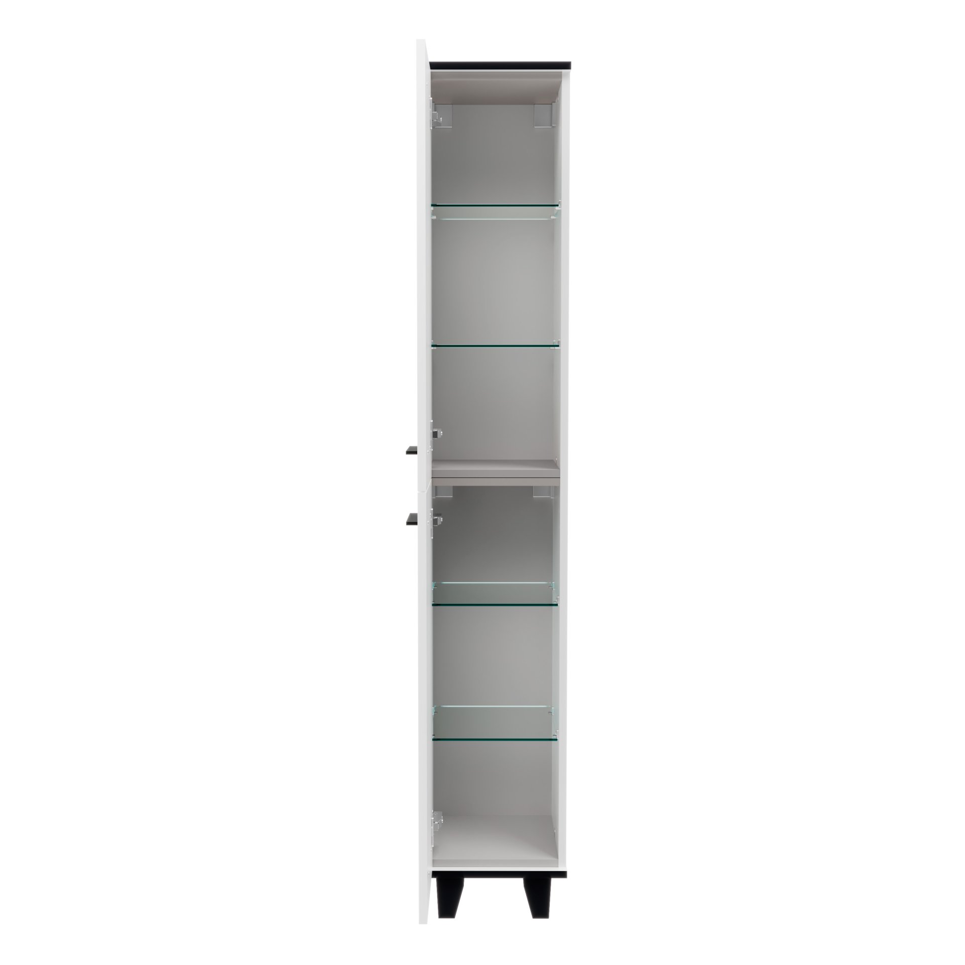 - Ausstattung: 2 Türen, 4 Glaseinlegeböden, Abdeckplatte, schwarze Kanten und 4 Sockelfüße (Höhe 10 cm)